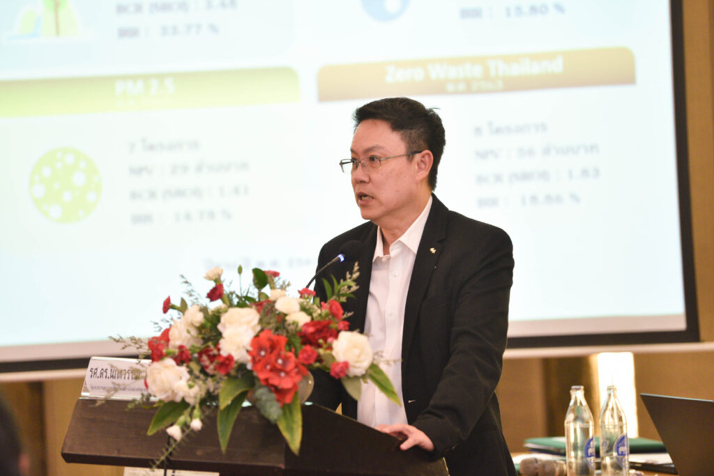 รศ.ดร.นภาวรรณ นพรัตนราภรณ์ ผู้อำนวยการแผนงานฯ กล่าวว่า ภาพรวมแผนงานศูนย์ขับเคลื่อนผลงานวิจัยด้านทรัพยากรธรรมชาติและสิ่งแวดล้อมสู่การใช้ประโยชน์ ได้รับการสนับสนุนทุนวิจัยด้านทรัพยากรธรรมชาติและสิ่งแวดล้อม จาก (วช.) ในปี 2557–2562 และในปี 2563–ปัจจุบัน จากแผนงานทั้ง 7 กิจกรรมได้แก่ กิจกรรมที่ 1) การประเมินผลภาพรวม กิจกรรมที่ 2) ประเมินความพร้อมใช้ทางเทคโนโลยี กิจกรรมที่ 3) ผลสัมฤทธิ์ของโครงการตามหลัก OECD/DAC กิจกรรมที่ 4) ประเมินความคุ้มค่า กิจกรรมที่ 5) จัดทำกรณีศึกษาโครงการวิจัยที่เป็นเลิศ กิจกรรมที่ 6) การขยายผลสู่การใช้ประโยชน์ และ กิจกรรมที่ 7) การพัฒนาฐานข้อมูลสู่การใช้ประโยชน์ จะเห็นได้ว่าในส่วนของ กิจกรรมที่ 3) การประเมินผลสัมฤทธิ์ของโครงการ 4 แผนงานวิจัย ประกอบด้วย ท้าทายไทยฯ 49 โครงการ Water Security 20 โครงการ PM 2.5 32 โครงการ และ Zero Waste Thailand 36 โครงการ โดยศึกษาความคุ้มค่าของผลงานวิจัย ของโครงการในปี 2563 จำนวน 137 โครงการ โดยใช้แนวทางการประเมินผลผลิต ผลลัพธ์ ผลกระทบ ผลสัมฤทธิ์ตามเกณฑ์ OECD/DAC โดยสอดคล้องกับหมุดหมาย 13 ประการ ซึ่งการประเมินระดับความพร้อมทางเทคโนโลยี และความพร้อมทางด้านสังคม การนำไปใช้ประโยชน์และขับเคลื่อนผลักดันสู่ผู้ใช้เป้าหมาย ทั้งภาครัฐ ภาคเอกชน ผู้ประกอบการ และภาคเอกชน รวมไปถึงการออกแบบจัดทำฐานข้อมูลการใช้ประโยชน์ด้านทรัพยากรธรรมชาติและสิ่งแวดล้อมให้เป็นมาตรฐานต่อเนื่องและเป็นปัจจุบัน เพื่อขับเคลื่อนประเทศอย่างเป็นรูปธรรมและยั่งยืน