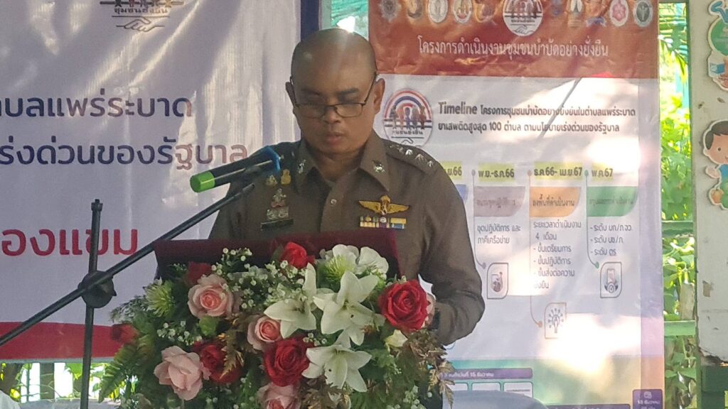 พล.ต.ท.สำราญ กล่าวว่า ตามนโยบายของรัฐบาล ที่ตระหนักถึงความสำคัญในการแก้ปัญหายาเสพติดอย่างยั่งยืน โดยกำชับไปยังทุกหน่วยที่เกี่ยวข้องดำเนินการแก้ไขปัญหา และปกป้องการแพร่ระบาดของยาเสพติด โดยเฉพาะในกลุ่มของเด็ก และเยาวชน ซึ่งถือเป็นกำลังหลักในอนาคต ซึ่งทางสำนักงานตำรวจแห่งชาติได้ตระหนักถึงความสำคัญในการป้องกัน แก้ไข บำบัดรักษา และช่วยเหลือผู้ติดยาเสพติด โดยเริ่มดำเนินการตั้งแต่กระบวนการค้นหา คัดกรอง ฟื้นฟู และลดอันตรายจากยาเสพติดอีกทั้งสร้างภูมิคุ้มกัน ติดตาม ดูแล และช่วยเหลือทางสังคม โดยใช้ชุมชนเป็นศูนย์กลางในการดูแลผู้ผ่านการบำบัดได้อย่างมีประสิทธิภาพ สามารถดำเนินชีวิต และอยู่ร่วมกับสังคมได้อย่างสงบสุข ภายใต้ทิศทางการเปลี่ยนแปลงในระดับสากล เป็นไปตามหลักการสาธารณสุขและสิทธิมนุษยชน ซึ่งในการดำเนินการในโครงการนี้เป็นโครงการเร่งด่วนของรัฐบาลประจำปีงบประมาณ 2567 โดยมีวัตถุประสงค์ ดังนี้ 1. เพื่อค้นหาและนำผู้เสพยาเสพติดเข้าสู่กระบวนการบำบัดโดยมีส่วนร่วมของชุมชน (CBT) 2. เพื่อคัดแยก คัดกรองผู้ป่วยจิตเวชที่เกิดจากการใช้ยาเสพติดตามกลุ่มสี เข้าสู่กระบวนการบำบัด โดยแพทย์โดยใช้รูปแบบ “หัวโทนโมเดล” 3. เพื่อกวาดล้างจับกุมผู้ค้ายาเสพติดในตำบลเป้าหมาย 100 ตำบลอย่างเด็ดขาด 4. เพื่อสร้างตำบลเปราะบางด้านยาเสพติดให้เป็น “ตำบลสีขาวปลอดยาเสพติด” 5. เพื่อให้เกิดการบูรณาการในการแก้ไขปัญหายาเสพติดร่วมกันของหน่วยงานที่เกี่ยวข้องในพื้นที่ เป้าหมาย สน.หนองแขม จึงได้พิจารณาคัดเลือกการดำเนินการตามโครงการนี้คือ แขวงหนองแขม จำนวน 5 ชุมชน เข้าร่วมโครงการในปีนี้ การปฏิบัติงานตามโครงการโดยชุดปฏิบัติการชุมชนบำบัดอย่างยั่งยืน