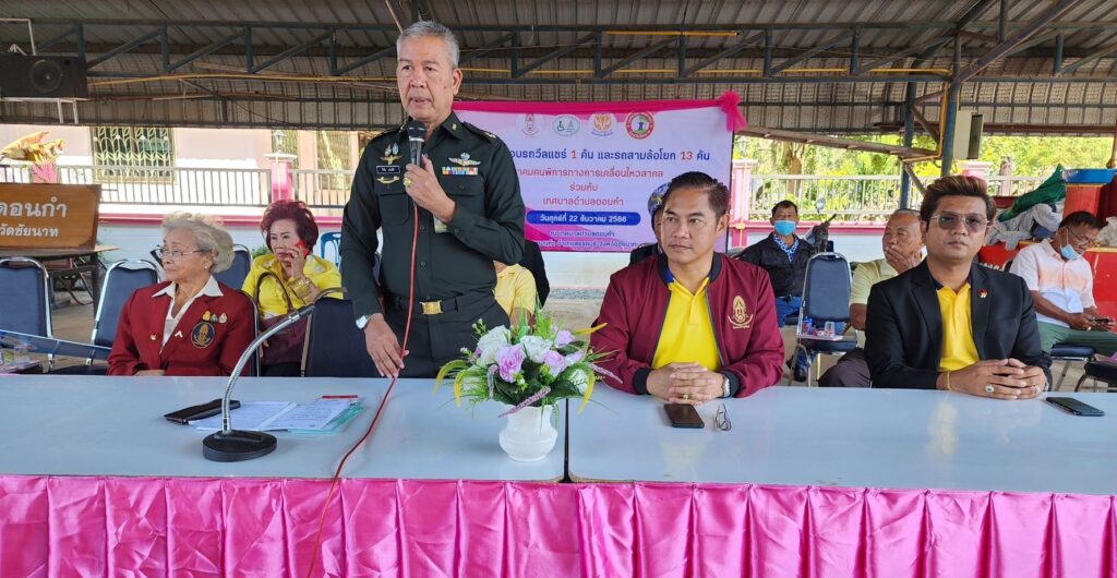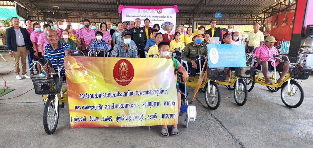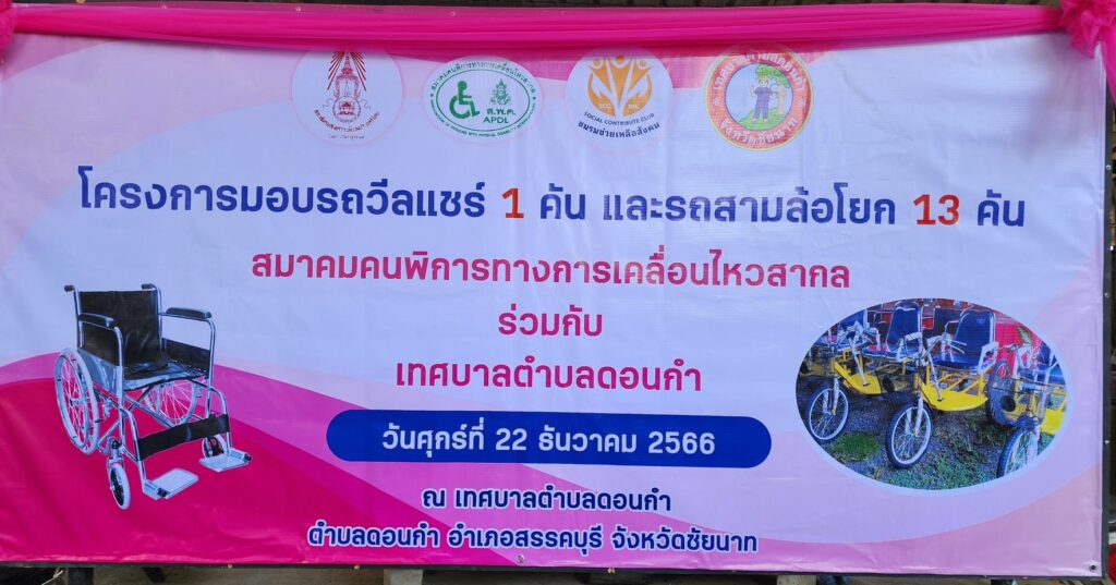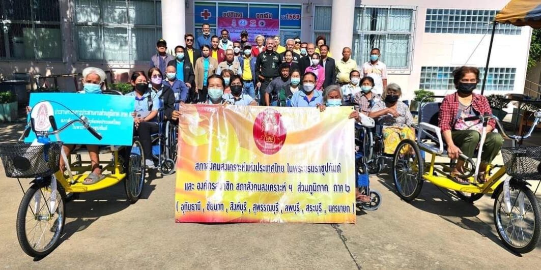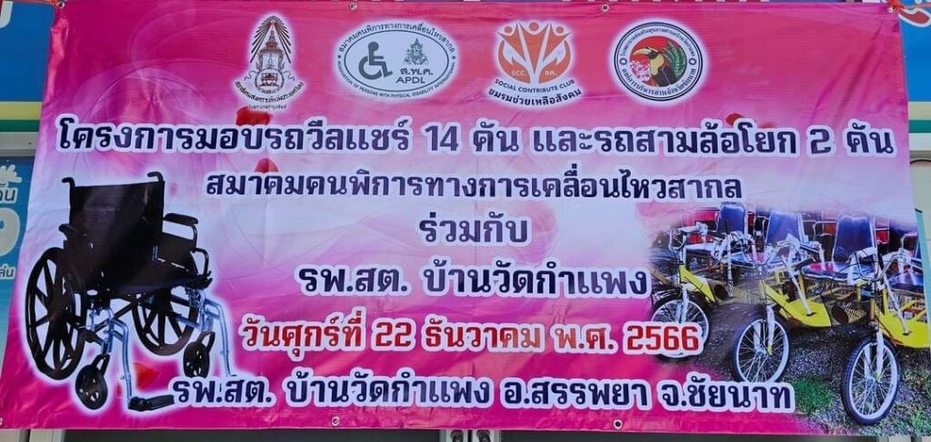 เมื่อวันที่ 22 ธันวาคม 2566 ที่ผ่านมา สภาสังคมสงเคราะห์แห่งประเทศไทย ในพระบรมราชูปถัมภ์ โดย ร้อยตำรวจโท ดร.มนัส โนนุช ประธานสภาสังคมสงเคราะห์ฯ มอบหมาย พันตรี ศิริชัย ทรัพย์ศิริ กรรมการอำนวยการสภาสังคมสงเคราะห์ฯ และนายกสมาคมคนพิการทางการเคลื่อนไหวสากล เป็นประธานในพิธีมอบรถวีลแชร์และสามล้อโยก ให้แก่ โรงพยาบาลส่งเสริมสุขภาพตำบลบ้านวัดกำแพง อ.สรรพยา และ เทศบาลตำบลดอนกำ อ.สรรคบุรี จ.ชัยนาท โดยมี นางอรชุน เหลืองวิเศษกาล ประธานกรรมการประสานงานส่วนภูมิภาค ภาค 8, นายอภิชาติ โล่ห์สุวรรณ์ ประธานกรรมการประสานงานส่วนภูมิภาค ภาค 2, ว่าที่ ร.ต.หญิง ศิวพร ทรัพย์ศิริ ประธานชมรมช่วยเหลือสังคม, นายธวัชชัย จิตต์เจริญ จิตอาสาข้าราชการบำนาญ และ นายธนวรรธน์ ทวี จิตอาสาข้าราชการบำนาญ ร่วมเป็นเกียรติ