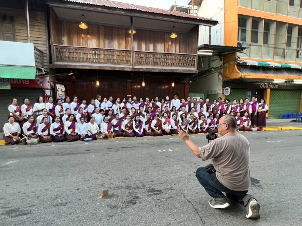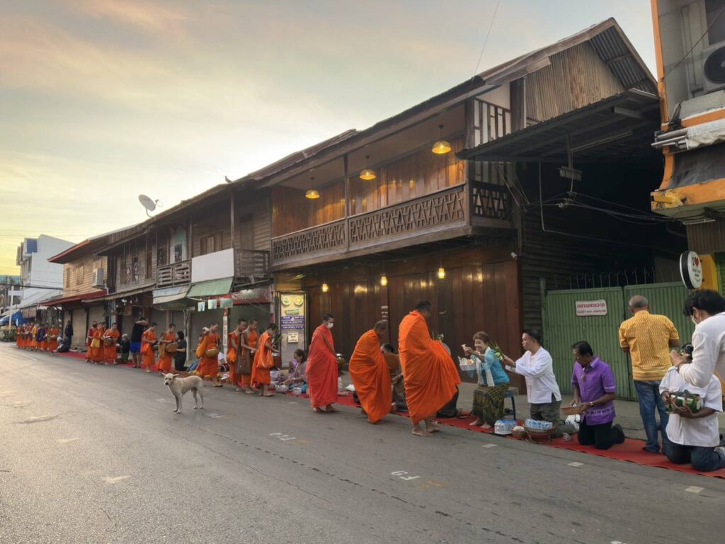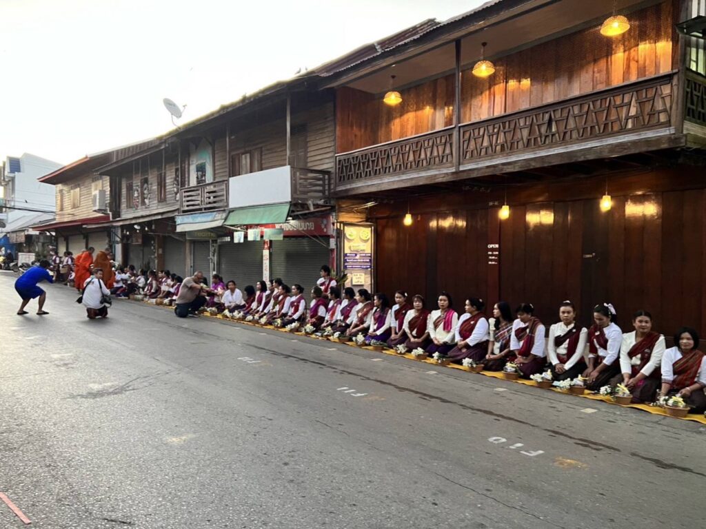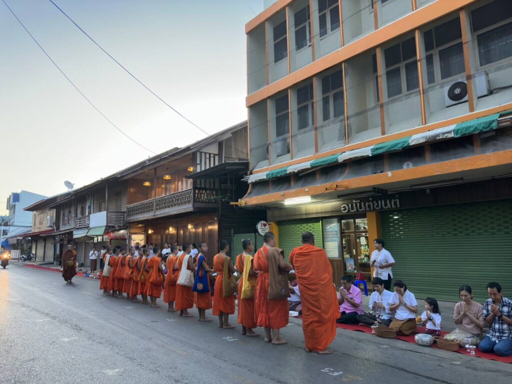 อาหารทั้งคาวหวานเพื่อมาทำบุญตักบาตรพระภิกษุสงฆ์ที่ออกมาบิณฑบาตรบริเวณหน้าบ้านไม้โบราณในถนนคนเดินไทหล่ม แม้ว่าสภาพ