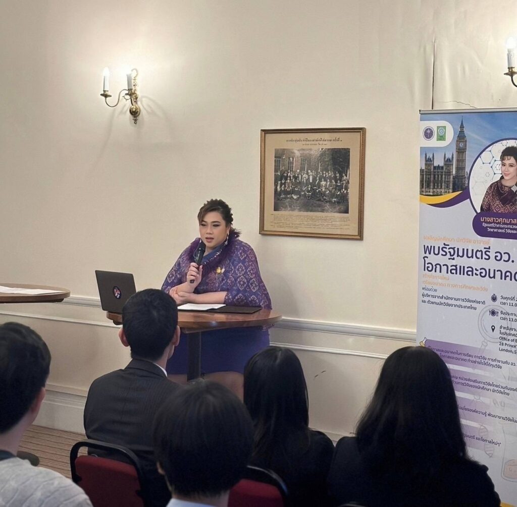 เมื่อวันที่ 22 ธ.ค.2566 นางสาวศุภมาส อิศรภักดี รมว.การอุดมศึกษาวิทยาศาสตร์ วิจัยและนวัตกรรม (อว.) ได้เดินทางมาบรรยายพิเศษเรื่อง “โอกาสและอนาคตการศึกษาวิจัยและนวัตกรรม” ณ สำนักงานผู้ดูแลนักเรียนในสหราชอาณาจักร โดยมีนักศึกษาและนักวิจัยของประเทศไทยที่ได้รับทุนมาศึกษาและทำวิจัยจากหลายสถาบันเข้าร่วมรับฟัง