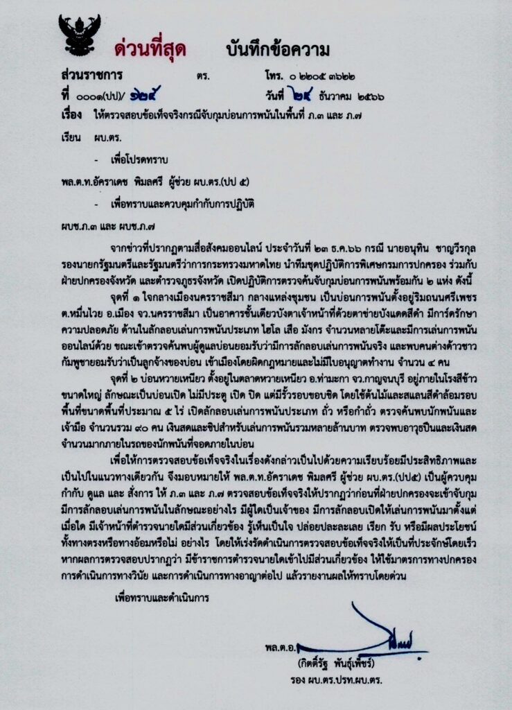 เมื่อวันที่ 24 ธันวาคม 2566 ที่สำนักงานตำรวจแห่งชาติ (ตร.) พล.ต.อ.กิตติ์รัฐ พันธุ์เพ็ชร์ รอง ผบ.ตร.ปรท.ผบ.ตร. ได้ทำหนังสือคำสั่งบันทึกด่วนที่สุด ให้พล.ต.ท.อัคราเดช พิมลศรี ผู้ช่วย ผบ.ตร.(ปป 5) มีใจความระบุว่า : เรื่องให้ตรวจสอบข้อเท็จจริงกรณีจับกุมบ่อนการพนันในพื้นที่ ภ.3 และ ภ.7 ให้ทราบและควบคุมกำกับการปฏิบัติ ผบช.ภ.3 และ ผบช.ภ.7 จากข่าวที่ปรากฏตามสื่อสังคมออนไลน์ ประจำวันที่ 23 ธ.ค.2566 กรณี นายอนุทิน ชาญวีรกุล รองนายกรัฐมนตรีและรัฐมนตรีว่าการกระทรวงมหาดไทย นำทีมชุดปฏิบัติการพิเศษกรมการปกครอง ร่วมกับ ฝ่ายปกครองจังหวัด และตำรวจภูธรจังหวัด เปิดปฏิบัติการตรวจคันจับกุมบ่อนการพนันพร้อมกัน 2 แห่ง ดังนี้