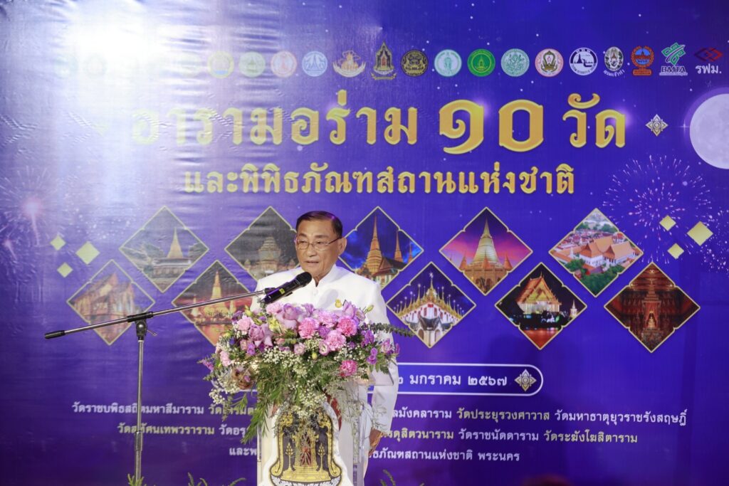 นายเสริมศักดิ์ พงษ์พานิช รัฐมนตรีว่าการกระทรวงวัฒนธรรม (รมว.วธ.) กล่าวว่า กระทรวงวัฒนธรรม โดยกรมการศาสนา ดำเนินนโยบายขับเคลื่อน Soft Power ภายใต้เทศกาล Thailand Winter Festivals ของรัฐบาล เพื่อส่งเสริมอุตสาหกรรมสร้างสรรค์ของไทยให้เป็นที่รู้จักอย่างกว้างขวาง จึงได้ดำเนินโครงการจาริกเส้นทางบุญในมิติทางศาสนา ปีงบประมาณ พ.ศ. 2567 จัดกิจกรรม “อารามอร่าม 10 วัดและพิพิธภัณฑสถานแห่งชาติ” ซึ่งเป็นศาสนสถานที่มีสิ่งศักดิ์สิทธิ์สำคัญ มีรูปแบบสถาปัตยกรรมและศิลปกรรมของไทยอันทรงคุณค่า จึงเปิดให้ประชาชนและนักท่องเที่ยวได้มีโอกาสสักการะสิ่งศักดิ์สิทธิ์เพื่อความเป็นสิริมงคล พร้อมชมความงดงามด้วยการประดับไฟยามค่ำคืนตลอดช่วงเทศกาลปีใหม่ โดยได้บูรณาการความร่วมมือกับสำนักนายกรัฐมนตรี กรุงเทพมหานคร (กทม.) การท่องเที่ยวแห่งประเทศไทย (ททท.) กองบัญชาการตำรวจนครบาล ตลอดจนความร่วมมือกับหน่วยงานในสังกัด ได้แก่ กรมศิลปากร และกรมส่งเสริมวัฒนธรรม รวมถึงภาคีเครือข่ายวัดในกรุงเทพมหานคร 10 แห่ง ประกอบด้วย 1) วัดราชบพิธสถิตมหาสีมาราม 2) วัดไตรมิตรวิทยาราม 3) วัดพระเชตุพนวิมลมังคลาราม 4) วัดประยุรวงศาวาส 5) วัดมหาธาตุยุวราชรังสฤษฎิ์ 6) วัดสุทัศนเทพวราราม 7) วัดอรุณราชวราราม 8) วัดเบญจมบพิตรดุสิตวนาราม 9) วัดราชนัดดาราม 10) วัดระฆังโฆสิตาราม และพิพิธภัณฑสถานแห่งชาติ พระนคร