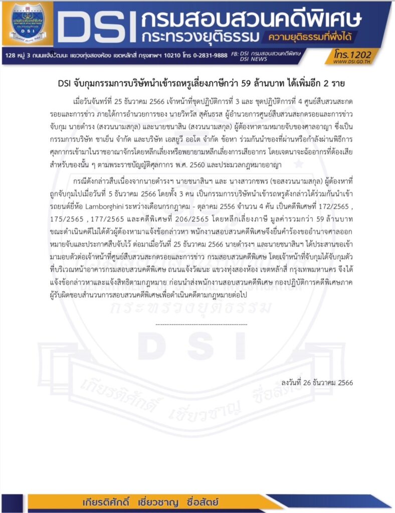กรณีดังกล่าวสืบเนื่องมาจากนายดำรงฯ นายชนาสินฯ และ นางสาวกชพร (ขอสงวนนามสกุล) ผู้ต้องหาที่ ถูกจับกุมไปเมื่อวันที่ 5 ธันวาคม 2566 โดยทั้ง 3 คน เป็นกรรมการบริษัทนำเข้ารถหรูดังกล่าวได้ร่วมกันนำเข้ารถยนต์ยี่ห้อ Lamborghini ระหว่างเดือนกรกฎาคม-ตุลาคม 2556 จำนวน 4 คัน เป็นคดีพิเศษที่ 172/2565,175/2565,177/2565 และคดีพิเศษที่ 206/2565 โดยหลีกเลี่ยงภาษี มูลค่ารวมกว่า 59 ล้านบาท ขณะดำเนินคดีไม่ได้ตัวผู้ต้องหามาแจ้งข้อกล่าวหา พนักงานสอบสวนคดีพิเศษจึงยื่นคำร้องขออำนาจศาลออกหมายจับและประกาศสืบจับไว้ ต่อมาเมื่อวันที่ 25 ธันวาคม 2566 นายดำรงฯ และนายชนาสินฯ ได้ประสานขอเข้ามามอบตัวต่อเจ้าหน้าที่ศูนย์สืบสวนสะกดรอยและการข่าว กรมสอบสวนคดีพิเศษ โดยเจ้าหน้าที่จับกุมได้จับกุมตัวที่บริเวณหน้าอาคารกรมสอบสวนคดีพิเศษ ถนนแจ้งวัฒนะ แขวงทุ่งสองห้อง เขตหลักสี่ กรุงเทพมหานคร จึงได้แจ้งข้อกล่าวหาและแจ้งสิทธิตามกฎหมาย ก่อนนำส่งพนักงานสอบสวนคดีพิเศษ กองปฏิบัติการคดีพิเศษภาค ผู้รับผิดชอบสำนวนการสอบสวนคดีพิเศษเพื่อดำเนินคดีตามกฎหมายต่อไป
