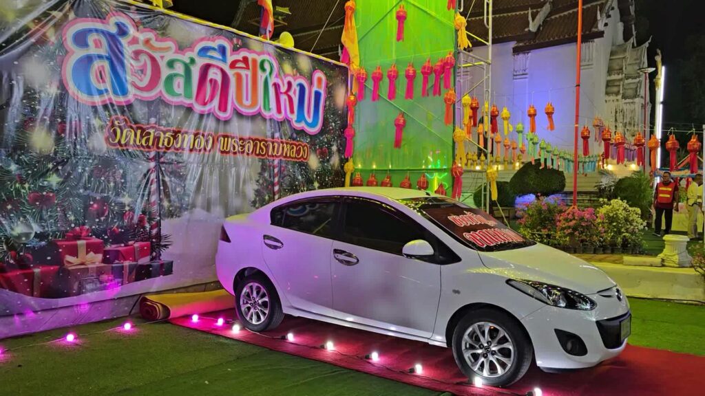 ซึ่งผู้เข้าร่วมพิธีทุกคน ยังได้ลุ้นรับแจกรางวัล สำหรับผู้โชคดีที่มาร่วมในพิธี เป็นรถเก๋งมาสด้า 2 จำนวน 1 คัน และรถจักรยานจำนวน 9 คัน รวมทั้ง หนังสือสวดมนต์ วัตถุมงคล ผ้ายันต์ ผลไม้มงคล และอื่น ๆ อีกมากมาย เป็นของขวัญมงคลต้อนรับปีใหม่ อีกด้วย