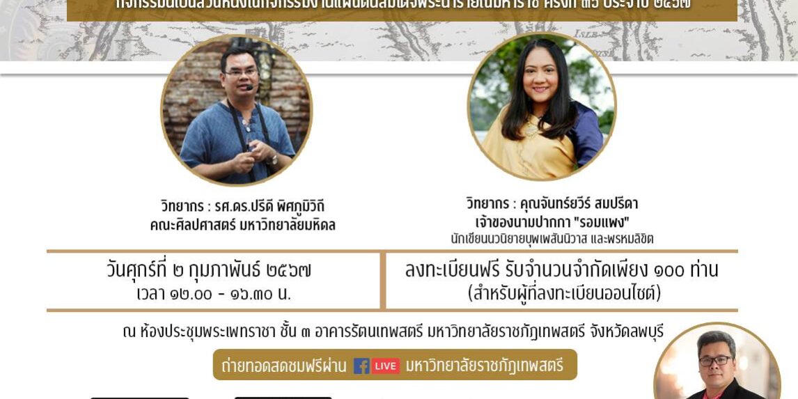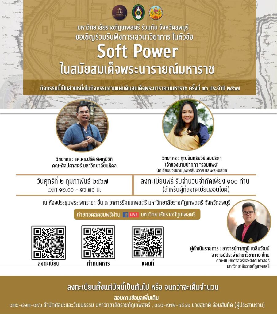มหาวิทยาลัยราชภัฏเทพสตรีร่วมกับจังหวัดลพบุรี ขอเชิญผู้ที่สนใจเข้าร่วมรับฟังการเสวนาวิชาการ ในหัวข้อ “Soft Power ในสมัยสมเด็จพระนารายณ์มหาราช” ในวันที่ 2 กุมภาพันธ์ 2567 ณ ห้องประชุมพระเพทราชา อาคารรัตนเทพสตรี มหาวิทยาลัยราชภัฏเทพสตรี ซึ่งกิจกรรมนี้เป็นส่วนหนึ่งในกิจกรรมของงานแผ่นดินสมเด็จพระนารายณ์มหาราช ครั้งที่ 36 ประจำปี 2567 โดยสามารถลงทะเบียนเข้าร่วมงานฟรีได้ตั้งแต่บัดนี้เป็นต้นไปหรือจนกว่าจะเต็มจำนวน (รับจำนวนจำกัดเพียง 100 ท่าน)