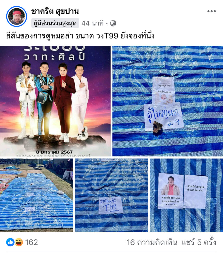 ผู้สื่อข่าวรายงานว่าได้มีผู้ใช้เฟสบุครายหนึ่งโพสต์ข้อความว่า “สีสันของการดูหมอลำ ขนาดวง T99 ยังจองที่นั่ง” พร้อมกันนี้ก็ได้โพสต์ภาพที่มีคนนำเสื่อ ผ้ายาง ผ้าใบพลาสติก มาปูเพื่อจองชมหมอลำวงดังที่จะมาแสดงในคืนวันนี้ที่วัดประชานิมิต ต.ท่าโรง อ.วิเชียรบุรี จ.เพชรบูรณ์ รวมทั้งมีการเขียนป้ายจองด้วยความความต่าง ๆ รวมถึงขึ้นมีการปริ้นรูปภาพของผู้จองมาวางไว้ที่เสื่อกันเลยทีเดียว จึงเดินทางไปตรวจสอบพบว่าวัดดังกล่าวกำลังจัดงานไหว้พระขอพรหลวงพ่อทันใจ ไหว้พระบรมสารีริกธาตุ ปิดทองรอยพระพุทธบาทจำลอง ประจำปี 2567 ระหว่างวันที่ 8 – 10 ม.ค.2567 โดยได้มีมรหรสพมาแสดงให้ชมทุกคืนโดยเฉพาะในคืนนี้เป็นคืนแรกมีหมอลำวงดัง “ระเบียบวาทะศิลป์” มาเปิดการแสดง ปรากฎว่าได้มีชาวบ้านและบรรดา FC ทั้งหลายนำเสื่อ ผ้ายาง ผ้าใบพลาสติก กระดาษ มาปูจองทั้งแต่เช้าจนถึงเที่ยงก็เต็มพื้นที่แล้ว ในขณะที่คณะหมอลำยังไม่ได้ตั้งเวลาเลย และพบว่ามีการเขียนจองด้วยข้อความต่างๆ ไว้บนกระดาษด้วย เช่น “ผู้ใหญ่นก หมู่9” “สาดผู้ช่วยหมู่ 15 ห้ามเคลื่อนย้าย” ซึ่งก็ได้มีการปริ้นรูปมาติดไว้ด้วย