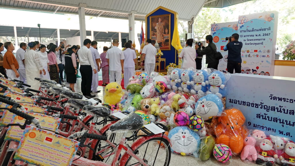 บรรยากาศภายในพิธีฯ มีเจ้าอาวาสวัดพระธรรมกาย เป็นประธานสงฆ์ นำประชาชนภาคีเครือข่าย “บวร” ปฏิบัติธรรม ถวายเป็นพระราชกุศลแด่พระบาทสมเด็จพระเจ้าอยู่หัว และมีนายนพดล พลซื่อ นายอำเภอคลองหลวง เป็นประธานนพิธีมอบของขวัญ เพื่อสนับสนุนการจัดกิจกรรมงานวันเด็กแห่งชาติ ประจำปี พ.ศ. 2567 แก่องค์กรภาคีเครือข่าย “บวร – บ้าน วัด โรงเรียน ราชการ” จำนวนกว่า 200 องค์กร เป็นสาธารณสงเคราะห์ ซึ่งภายในงานฯ มีนางสาวบุญจันทร์ บ่อไทย กรรมการมูลนิธิธรรมกาย ผู้แทนคณะกรรมการดำเนินงานกล่าวรายงานฯ และมีผู้บริหารองค์กรภาครัฐ ภาคเอกชน ภาคประชาสังคม ผู้นำชุมชนและหมู่บ้าน อาทิ ว่าที่ร้อยตรีธีระพล โชคนำชัย นายอำเภอหนองเสือ นางนิภาวรรณ พัฒนชีรวุฒิ นายกพุทธสมาคมจังหวัดปทุมธานี นายธเนศ รื่นกลิ่น ประธานสมาพันธ์หมู่บ้านจัดสรรอำเภอคลองหลวง เข้าร่วมงานฯ โดยพร้อมเพรียงกัน