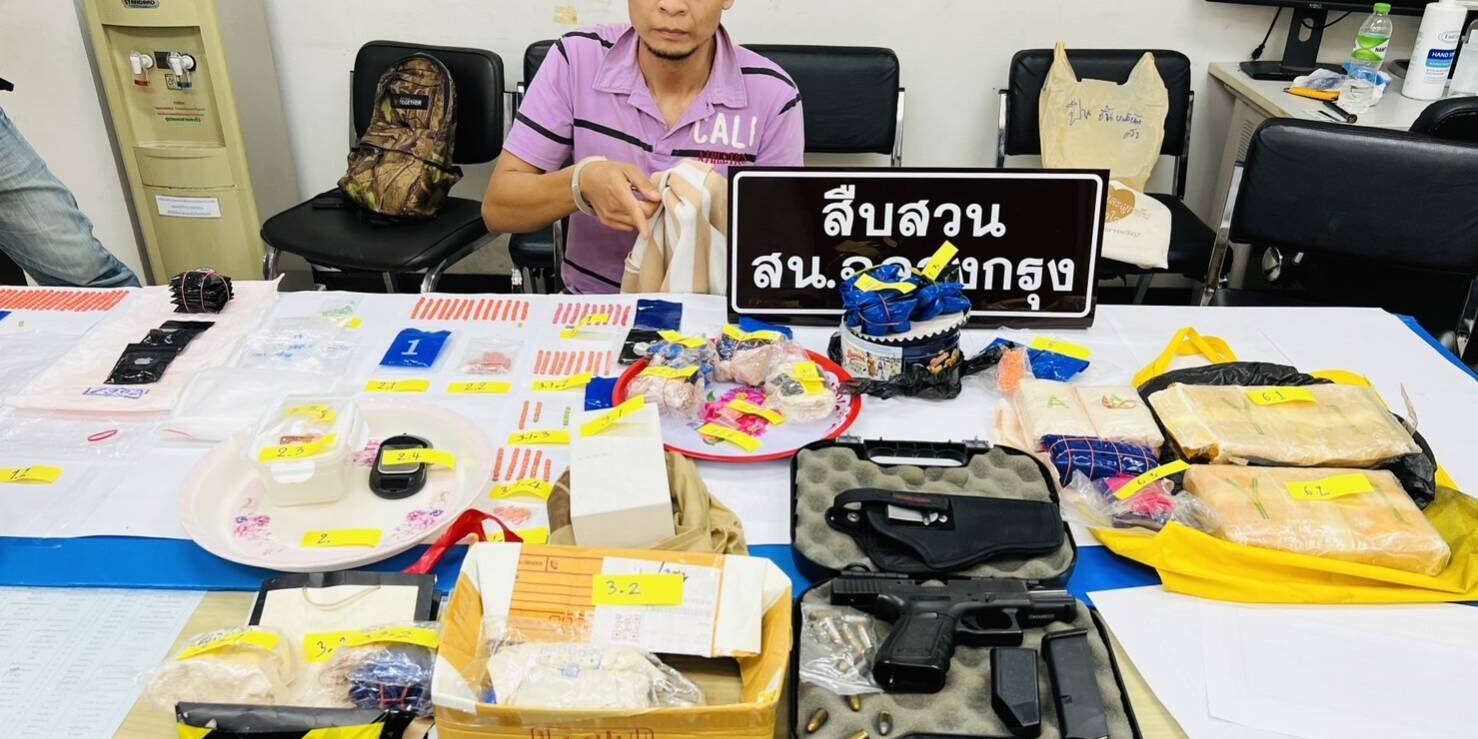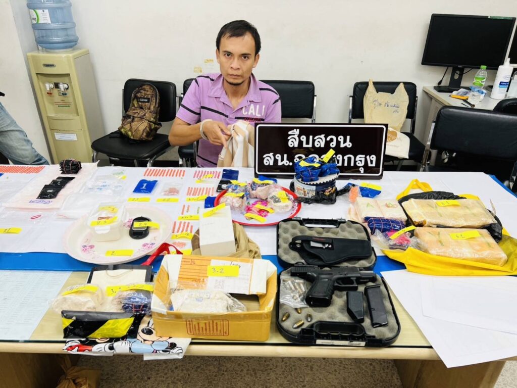 พร้อมด้วยของกลาง ยาเสพติดให้โทษประเภทที่ 1 (ยาบ้าหรือเมทแอมเฟตามีน) จำนวน 26,646 เม็ด ยายาไอซ์หรือเมทแอมเฟตามีน) น้ำหนัก 6.65 กรัม (ชั่งไม่รวมถุง) อาวุธปืนชนิดกึ่งอัตโนมัติ ยี่ห้อกล็อก ขนาด 9 มม. จำนวน 1 กระบอก ลูกกระสุนปืน ขนาด 9.มม. จำนวน 13 ลูกโทรศัพท์มือถือยี่ห้อ ออปโป้ สีดำ พร้อมซิมการ์ด ใช้สำหรับติดต่อซื้อขายยาเสพติด จำนวน 1 เครื่อง