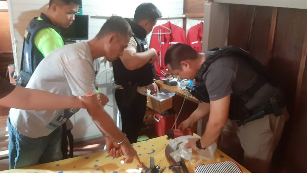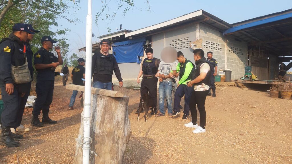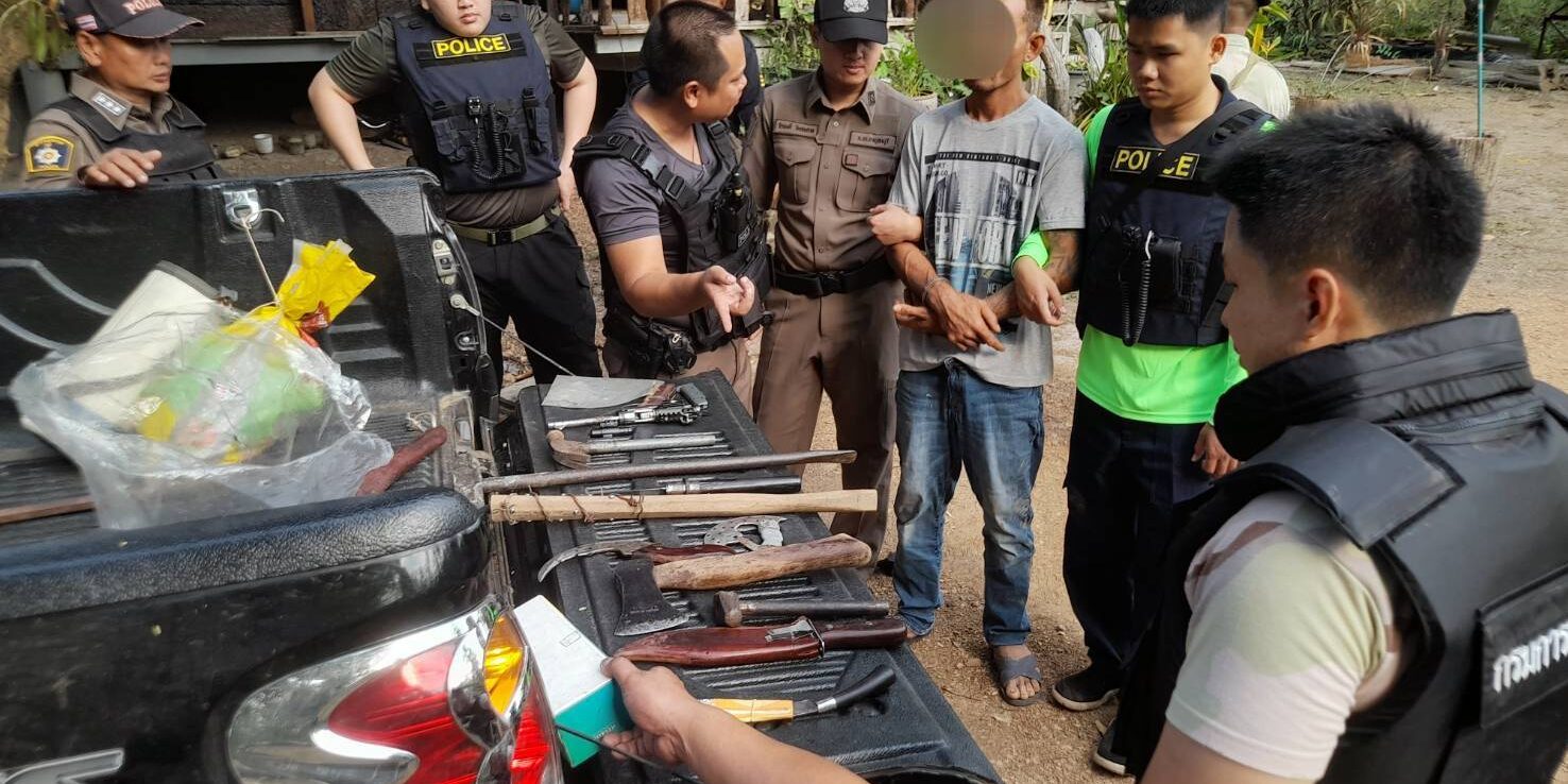 วันที่ 14 ม.ค. พล.ต.ท.นัยวัฒน์ ผะเดิมชิต ผบช.ภ.7 และ พล.ต.ต.นครินทร์ สุคนธวิท ผบก.ภ.จว.กาญจนบุรี สั่งการให้ พ.ต.อ.ปิโยรส กัณหะสิริ ผกก.สภ.ด่านแม่แฉลบ นำกำลังฝ่ายสืบสวนเข้าจับกุมตัว นายปรีชา เทพทอง อายุ 40 ปี ตามหมายจับศาลจังหวัดกาญจนบุรี เลขที่ 26/2567 ลงวันที่ 11 ม.ค.67 ข้อหาบุกรุกเคหสถานในเวลากลางคืนและทำให้เสียทรัพย์ พร้อมของกลาง ปืนสั้นไทยประดิษฐ์ขนาด .22 จำนวน 1 กระบอก แมกกาซีน ปืน 1 อัน ค้อนปอนด์ 3 อัน ขวาน 2 อัน มีดดาบ 1 เล่ม มีดปลายแหลม 1 เล่ม ไม้พันด้วยลวดหนาม ตอกหัวเหล็ก ซึ่งเป็นอาวุธโดยสภาพ 1 อัน และรถกระบะ อีก 1 คัน โดยจับกุมตัวได้ที่ บริเวณท้องไร่หน้าบ้านเลขที่ 56 หมู่ 2 ก่อนนำตัวไปขยายผลตรวจค้นในบ้านเลขที่ 125 หมู่ 2 ต.ด่านแม่แฉลบ อ.ศรีสวัสดิ์ จ.กาญจนบุรี