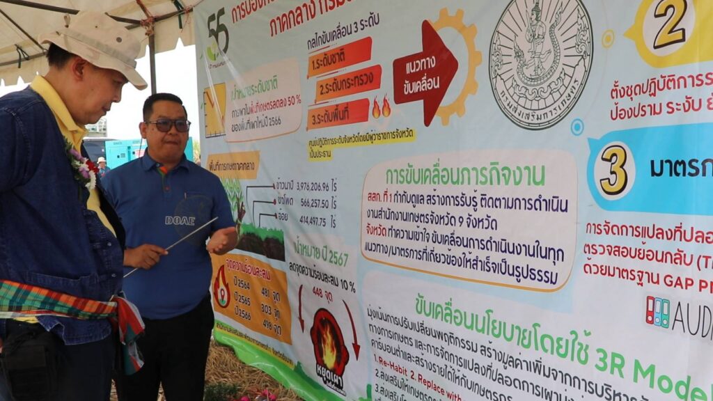 ทั้งนี้ การจัดงาน ฯ ดังกล่าว มีสาเหตุอันเนื่องมาจากสถานการณ์ของประเทศไทยในปัจจุบันประสบปัญหาหมอกควันปกคลุม โดยเฉพาะ PM 2.5 ที่ส่งผลกระทบต่อสุขภาพอนามัยของประชาชนและเศรษฐกิจของประเทศเป็นอย่างมาก สาเหตุส่วนหนึ่งเกิดจากการเผาในพื้นที่เกษตร โดยเกษตรกรจะเผาหลังการเก็บเกี่ยวข้าว อ้อย และข้าวโพด เพื่อเร่งรอบการผลิตและสร้างความสะดวกในการไถเตรียมดินสำหรับฤดูกาลต่อไป หรือเผาในไร่อ้อยเพื่อลดต้นทุนค่าจ้างตัดอ้อย ซึ่งการเผาดังกล่าวยังทำลายอินทรีย์วัตถุ ธาตุอาหาร และโครงสร้างดิน ทำให้ดินขาดความอุดมสมบูรณ์ ผลผลิตจึงลดต่ำลง เกษตรกรมีต้นทุนในการปรับปรุงบำรุงดินสูงขึ้น ส่งผลให้เกษตรกรมีรายได้น้อยลง และคุณภาพชีวิตก็น้อยลงตามไปด้วย ซึ่งจะเห็นได้ว่าการเผาเศษวัสดุเหลือใช้ทางการเกษตรส่งผลกระทบต่อประชาชนและประเทศไทยเป็นวงกว้างทั้งระดับจุลภาคและมหภาค ด้วยเหตุนี้ กรมส่งเสริมการเกษตร จึงได้เร่งดำเนินการแก้ไขปัญหาดังกล่าว โดยการขับเคลื่อนนโยบายป้องกันและแก้ปัญหาการเผาในพื้นที่เกษตรกรรม ประจำปี 2566/67 ด้วยการดำเนินการเชิงรุกผ่านหลักการ 3R Model ของกระทรวงเกษตรและสหกรณ์ ดังนี้ 1) การปรับเปลี่ยนพฤติกรรมการปลูกพืชชนิดเดิมแบบไม่เผา โดยการนำเครื่องจักรเข้ามาช่วยในการเก็บเกี่ยว และส่งเสริมการแปรรูปเพิ่มมูลค่าเศษวัสดุทางการเกษตร เพื่อลดการเผา (Re – Habit) 2) เปลี่ยนชนิดพืชที่ปลูกบนที่สูงจากพืชไร่เป็นไม้ผล พืชเศรษฐกิจแบบผสมผสาน ที่มีมูลค่าสูง เช่น อะโวกาโด ทุเรียน หรือไม้โตเร็ว หรือปลูกผักในโรงเรือน (Replace with perennial Crops) 3) เปลี่ยนเป็นพืชทางเลือกบนพื้นที่ราบ เปลี่ยนพื้นที่นาปรัง หรือพื้นที่นอกเขตชลประทานให้ปลูกข้าวโพดหรือพืชตระกูลถั่วทดแทนการทำนาปรัง (Replace with Alternate crops) โดยมีแนวทางการขับเคลื่อนนโยบายทั้งหมด 3 ด้าน คือ 1) เตรียมการ โดยการส่งเสริมเกษตรปลอดการเผา บริหารจัดการเพิ่มมูลค่าเศษวัสดุทางการเกษตร 2) เผชิญเหตุ ตั้งชุดปฏิบัติการระดับอำเภอ เฝ้าระวังป้องปราม ระงับ ยับยั้ง 3) มาตรการการจัดการแปลงที่ปลอดการเผา สามารถตรวจสอบย้อนกลับด้วยมาตรฐาน GAP PM 2.5 Free