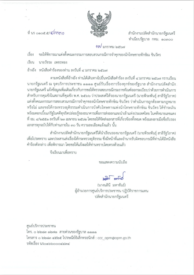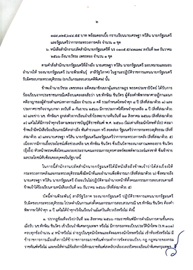 ในการนี้สำนักงานปลัดสำนักนายกรัฐมนตรีได้มีหนังสือถึงตน แจ้งว่าได้ส่งเรื่องให้กระทรวงการคลังและกระทรวงยุติธรรมซึ่งมีหน้าที่และอำนาจเพื่อพิจารณา ซึ่งหมายถึง นายเศรษฐา ทวีสิน นายกรัฐมนตรี ยังละเว้นไม่ปฏิบัติตามอำนาจหน้าที่ตั้งคณะกรรมการสอบสวนตามที่ตนได้ร้องเรียนตามหนังสือลงวันที่ ๒๖ ธันวาคม ๒๕๖๖