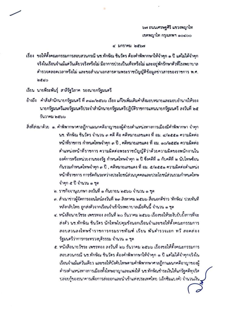 ๕. ขอให้ตั้งกรรมการสอบสวนกรณีกล้องวงจรปิดโรงพยาบาลตำรวจเสียทุกตัวทุกชั้นและขอให้ประสานงานสั่งการให้ติดตั้งกล้องวงจรปิดที่ชั้น ๑๔ โรงพยาบาลตำรวจภายใน ๗ วันเพราะ นช.ทักษิณ ชินวัตร มีสภาพเป็นนักโทษเด็ดขาดอยู่ภายใต้กฎหมายของกรมราชทัณฑ์