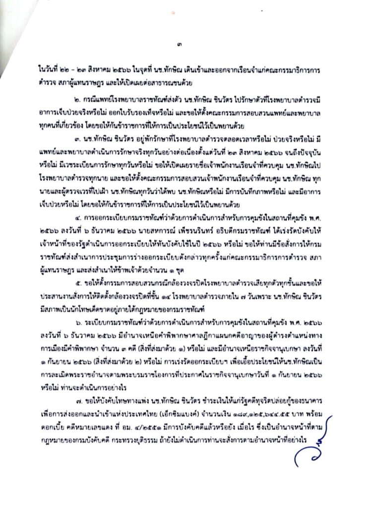 ในวันที่ ๒๒ – ๒๓ สิงหาคม ๒๕๖๖ ในจุดที่ นช.ทักษิณ เดินเข้าและออกจากเรือนจำแก่คณะกรรมาธิการการตำรวจ สภาผู้แทนราษฎร และให้เปิดเผยต่อสาธารณชนด้วย