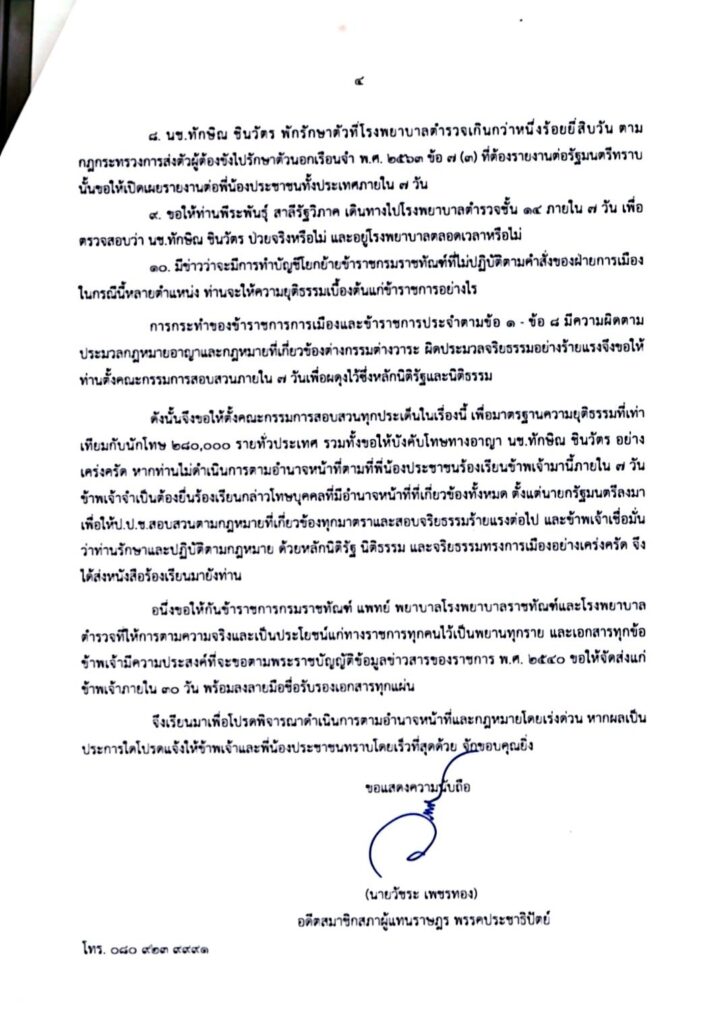 ดังนั้นจึงขอให้ตั้งคณะกรรมการสอบสวนทุกประเด็นในเรื่องนี้ เพื่อมาตรฐานความยุติธรรมที่เท่าเทียมกับนักโทษ ๒๘๐,๐๐๐ รายทั่วประเทศ รวมทั้งขอให้บังคับโทษทางอาญา นช.ทักษิณ ชินวัตร อย่างเคร่งครัด หากไม่ดำเนินการตามอำนาจหน้าที่ตามที่พี่น้องประชาชนร้องเรียนตนมานี้ภายใน ๗ วัน ตนจำเป็นต้องยื่นร้องเรียนกล่าวโทษบุคคลที่มีอำนาจหน้าที่ที่เกี่ยวข้องทั้งหมด ตั้งแต่นายกรัฐมนตรีลงมาเพื่อให้ ป.ป.ช.สอบสวนตามกฎหมายที่เกี่ยวข้องทุกมาตราและสอบจริยธรรมร้ายแรงต่อไป และตนเชื่อมั่นว่าท่านรักษาและปฏิบัติตามกฎหมาย ด้วยหลักนิติรัฐ นิติธรรม และจริยธรรมทรงการเมืองอย่างเคร่งครัด จึงได้ส่งหนังสือร้องเรียนมา