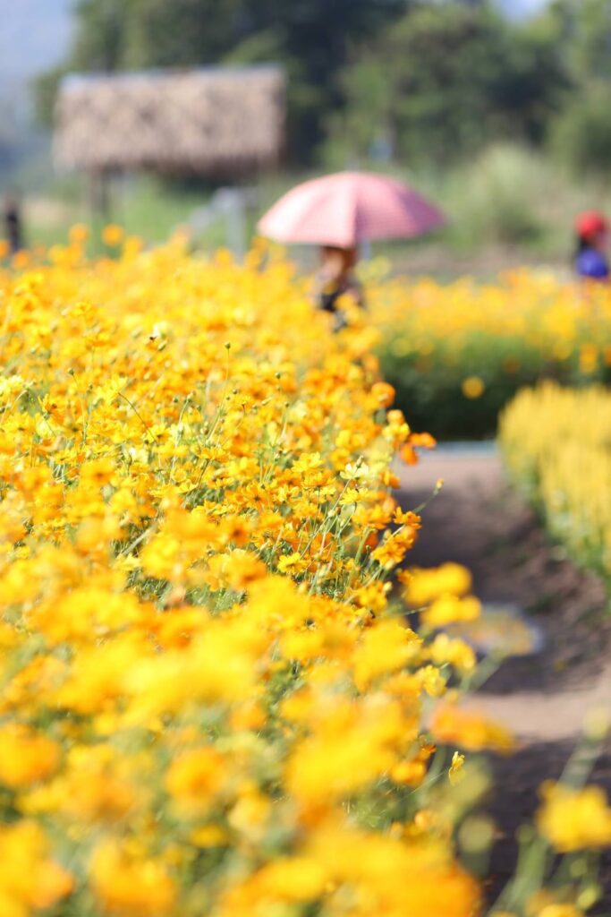 ทุ่งต้นคอสมอสสีเหลือง สีขาว สีชมพูบานเย็น สีส้ม ถ่ายได้หลายมุมมากๆดอสมอสชมพูคอสมอสเหลืองคอสมอสขาว