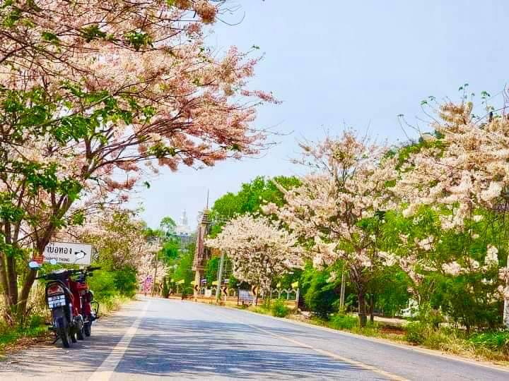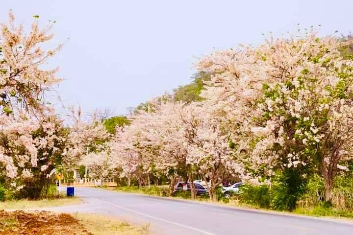 จนถึงปลายเดือน มี.ค. แล้วดอกจะร่วงโรยไป ซึ่งขณะนี้ดอกเริ่มออกแล้ว ทั้งสีขาวและชมพู สวยงามเหมือนอยู่ในแดนสวรรค์ ซึ่งจะอยู่ในช่วงต้นเดือนมีนาคม หากใครผ่านไปมาแถวนี้ หรือจะตั้งใจมาชมความงดงามก่อนดอกร่วงโรย