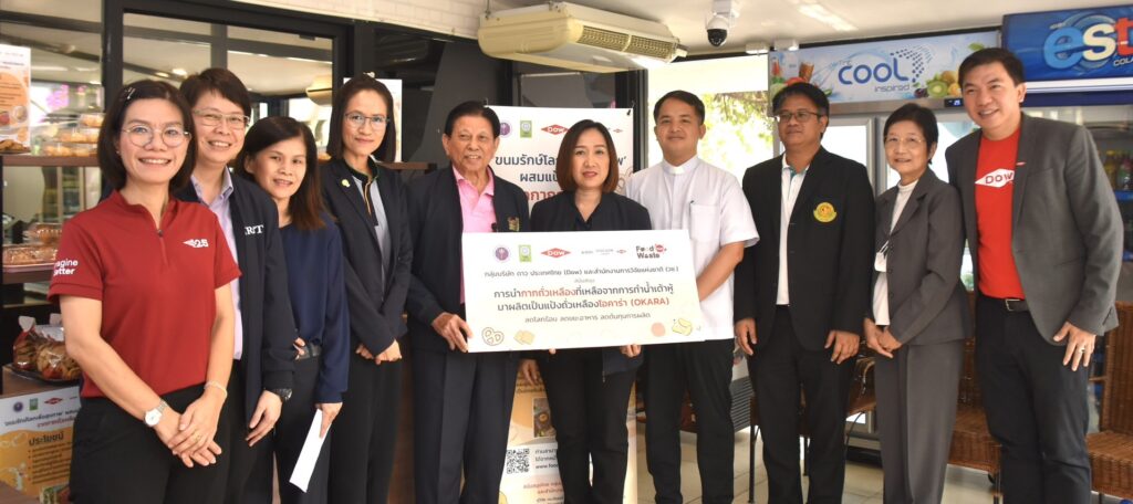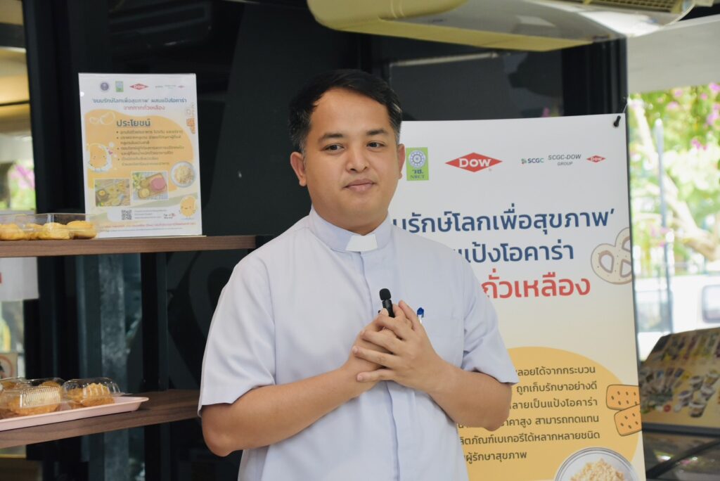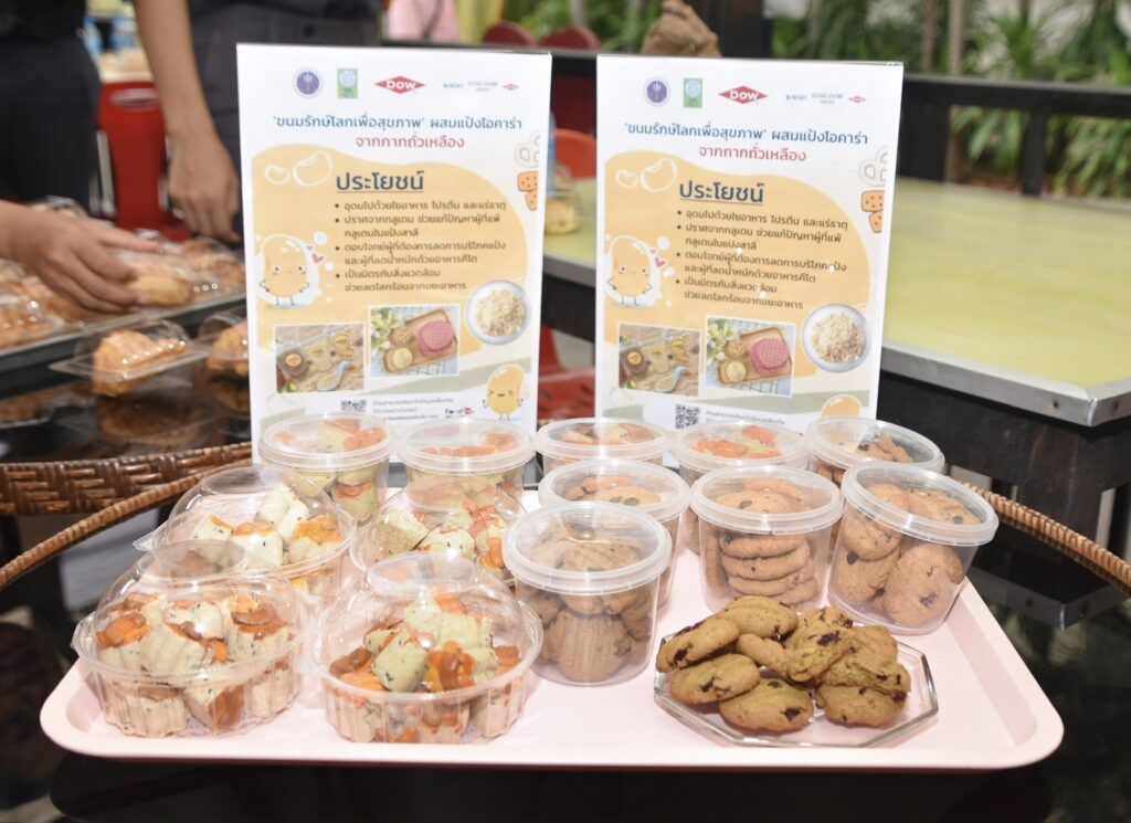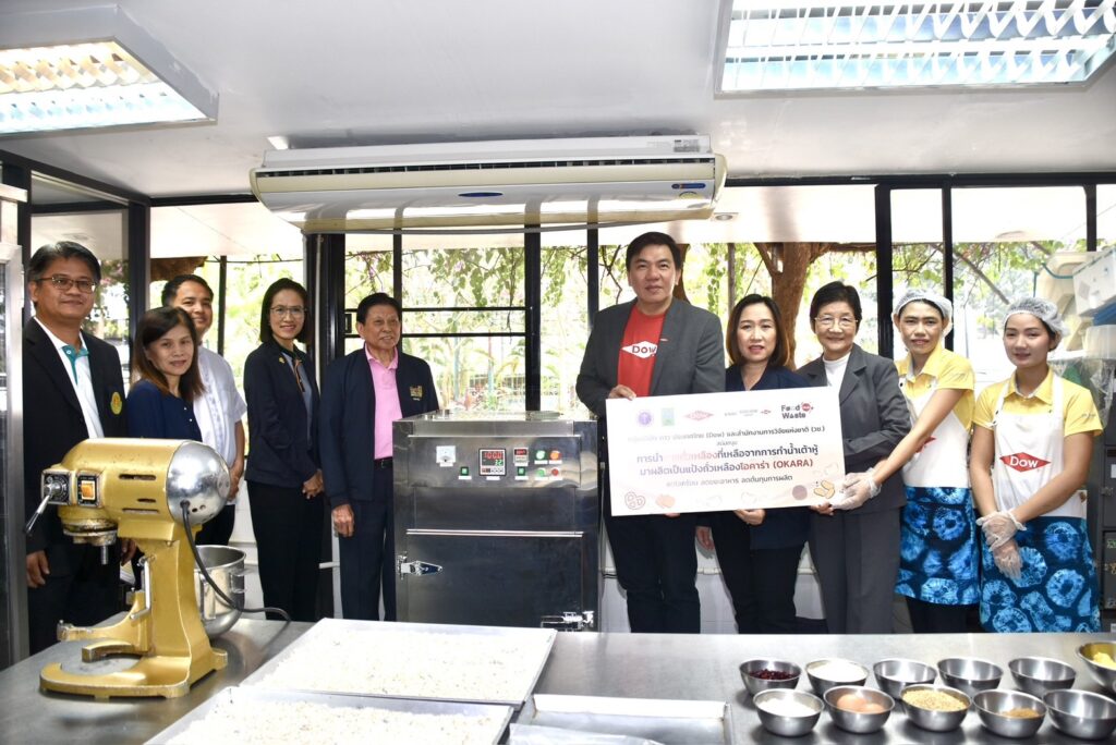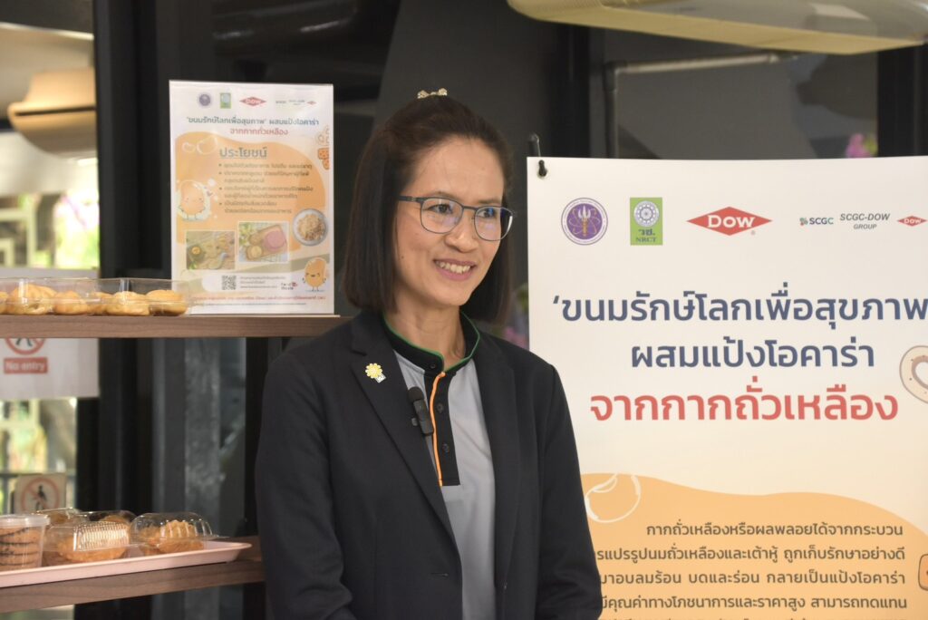 นางสาวศิรินทร์พร เดียวตระกูล ผู้เชี่ยวชาญด้านระบบวิจัย กล่าวว่า สำนักงานการวิจัยแห่งชาติ (วช.) เป็นหน่วยงานบริหารจัดการทุนวิจัยและนวัตกรรมของประเทศ ที่มุ่งเน้นการนำผลงานวิจัยสู่ผู้ใช้ประโยชน์ โดยในประเด็นด้านทรัพยากรรธรรมชาติและสิ่งแวดล้อม กลุ่มเรื่อง Zero Waste ทั้งงานวิจัยที่เกี่ยวกับการจัดการขยะมูลฝอยชุมชน และการจัดการวัสดุเหลือใช้ทางการเกษตร ซึ่งขยะอาหาร หรือ Food waste เป็นปัญหาสำคัญของประเทศ ด้วยขยะอาหารมักจะถูกทิ้งรวมกับขยะมูลฝอยชุมชน ดังนั้นเราต้องอาศัยความร่วมมือกับทุกภาคส่วนในการจัดการ ครั้งนี้เป็นโอกาสอันดี ที่ (วช.) กลุ่มบริษัทดาว ประเทศไทย และ มก. จับมือกันขับเคลื่อนถ่ายทอดงานวิจัยสู่การนำไปใช้ประโยชน์ควบคู่ไปกับการพัฒนาสังคม ซึ่ง มูลนิธิคุณพ่อเรย์ เป็นผู้ใช้ประโยชน์จากผลงานวิจัย ที่นำผลงานวิจัย“แป้งโอคาร่าจากกากถั่วเหลือง” นำไปผลิตเบเกอรี่ ได้แก่ บราวนี่ คุกกี้ และ คุกกี้สิงคโปร์ จำหน่ายที่ร้านเบเกอรี่สคูลของมูลนิธิคุณพ่อเรย์ เป็นการช่วยพัฒนาสังคมและให้โอกาสแก่ผู้ด้อยโอกาส ที่มุ่งเน้นการแก้ไขปัญหาความเหลื่อมล้ำในสังคม เพื่อยกระดับคุณภาพชีวิตประชาชนให้ดียิ่งขึ้น