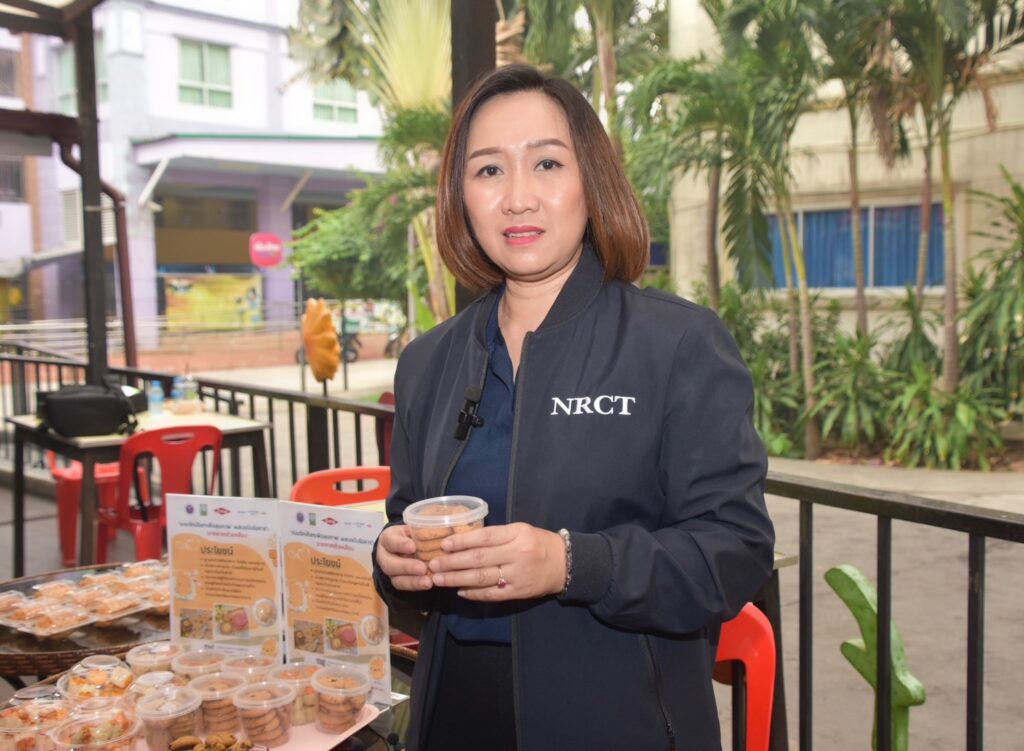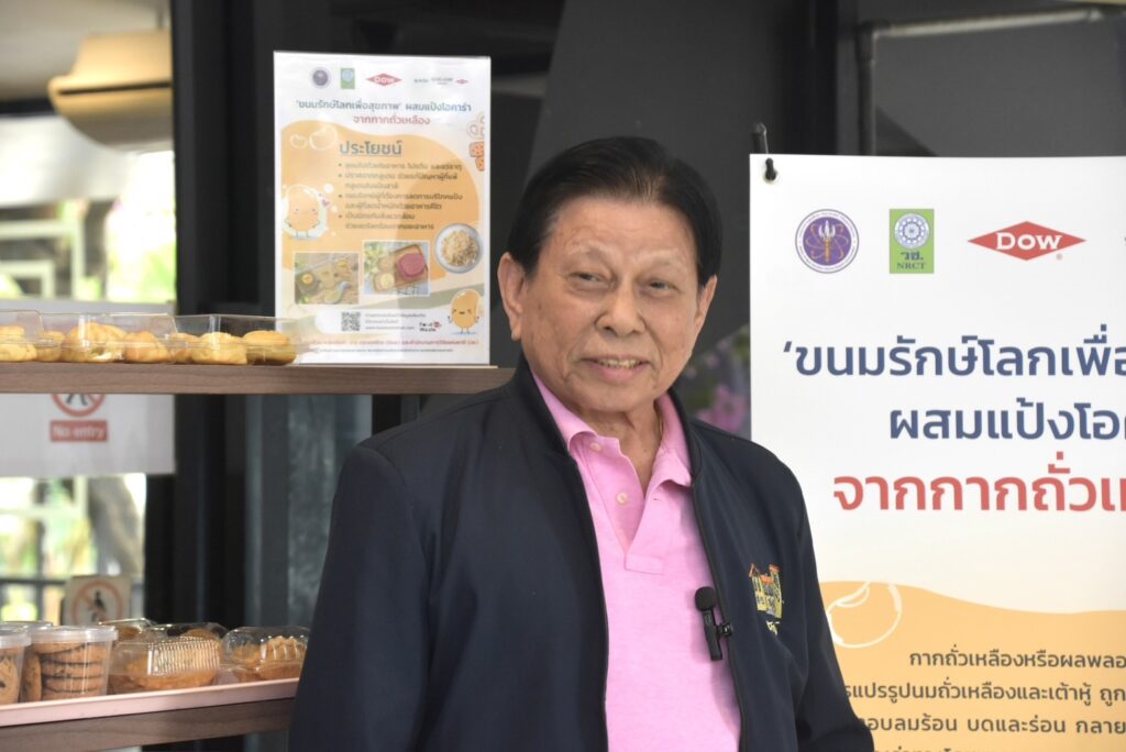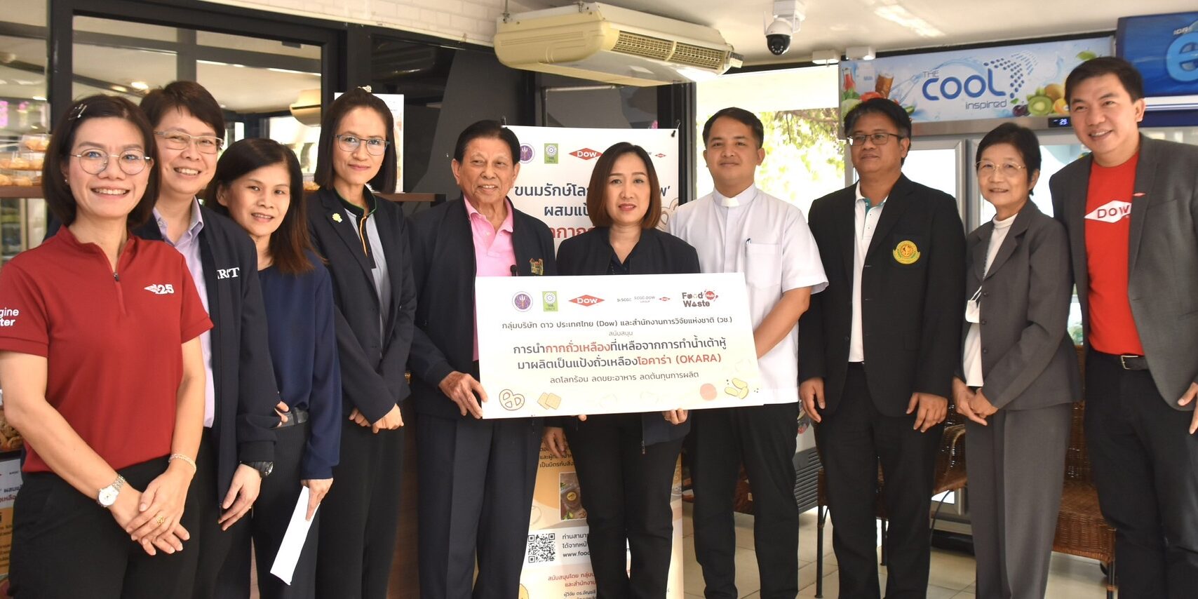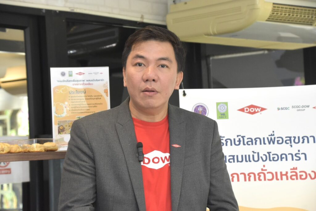 นางสาวศิรินทร์พร เดียวตระกูล ผู้เชี่ยวชาญด้านระบบวิจัย กล่าวว่า สำนักงานการวิจัยแห่งชาติ (วช.) เป็นหน่วยงานบริหารจัดการทุนวิจัยและนวัตกรรมของประเทศ ที่มุ่งเน้นการนำผลงานวิจัยสู่ผู้ใช้ประโยชน์ โดยในประเด็นด้านทรัพยากรรธรรมชาติและสิ่งแวดล้อม กลุ่มเรื่อง Zero Waste ทั้งงานวิจัยที่เกี่ยวกับการจัดการขยะมูลฝอยชุมชน และการจัดการวัสดุเหลือใช้ทางการเกษตร ซึ่งขยะอาหาร หรือ Food waste เป็นปัญหาสำคัญของประเทศ ด้วยขยะอาหารมักจะถูกทิ้งรวมกับขยะมูลฝอยชุมชน ดังนั้นเราต้องอาศัยความร่วมมือกับทุกภาคส่วนในการจัดการ ครั้งนี้เป็นโอกาสอันดี ที่ (วช.) กลุ่มบริษัทดาว ประเทศไทย และ มก. จับมือกันขับเคลื่อนถ่ายทอดงานวิจัยสู่การนำไปใช้ประโยชน์ควบคู่ไปกับการพัฒนาสังคม ซึ่ง มูลนิธิคุณพ่อเรย์ เป็นผู้ใช้ประโยชน์จากผลงานวิจัย ที่นำผลงานวิจัย“แป้งโอคาร่าจากกากถั่วเหลือง” นำไปผลิตเบเกอรี่ ได้แก่ บราวนี่ คุกกี้ และ คุกกี้สิงคโปร์ จำหน่ายที่ร้านเบเกอรี่สคูลของมูลนิธิคุณพ่อเรย์ เป็นการช่วยพัฒนาสังคมและให้โอกาสแก่ผู้ด้อยโอกาส ที่มุ่งเน้นการแก้ไขปัญหาความเหลื่อมล้ำในสังคม เพื่อยกระดับคุณภาพชีวิตประชาชนให้ดียิ่งขึ้น