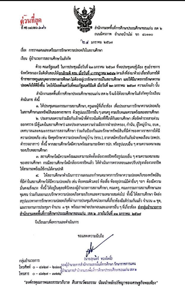 วันที่ 24 มกราคม 2567 : นายอภิชัย เสนาโยธี ผอ.สพป.ขอนแก่น เขต 2 กล่าวว่า ด้วย ว่าที่ร้อยตรี ธนุ วงษ์จินดา เลขาธิการคณะกรรมการการศึกษาขั้นพื้นฐาน ได้มีข้อสั่งการไปยัง ผอ.สพท. ทุกเขต จากกรณีที่ ครม. มีมติยกเว้นให้ครูไม่ต้องอยู่เวรรักษาการณ์ของหน่วยงานราชการ ซึ่งเกิดจากข้อห่วงใยของนายกรัฐมนตรี และรองนายกรัฐมนตรี (นายอนุทิน ชาญวีรกูล) รวมทั้ง พลตำรวจเอก เพิ่มพูน ชิดชอบ รัฐมนตรีว่าการกระทรวงศึกษาธิการ (รมว.ศธ.) และนายสุรศักดิ์ พันธ์เจริญวรกุล รมช.ศธ. มีความห่วงใยต่อเหตุการณ์ความรุนแรงที่ครูในจังหวัดเชียงราย ถูกชายบุกทำร้ายในโรงเรียนขณะอยู่เวรกลางวัน โดยรองนายกรัฐมนตรี ในฐานะที่กำกับดูแลกระทรวงศึกษาธิการ ได้สนับสนุนให้มีการยกเลิกมติ ครม. ปี 2542 เว้นในส่วนที่เกี่ยวกับการอยู่เวรรักษาการณ์ของหน่วยงานราชการ ซึ่งมีผลตั้งแต่วันที่ ครม.มีมติ ให้ทุกเขตเร่งชี้แจงให้โรงเรียนในสังกัดทราบ พร้อมให้ประชุมชี้แจงให้ครู และคณะกรรมการสถานศึกษา รวมถึงผู้เกี่ยวข้อง เพื่อร่วมกันประสานการรักษาความปลอดภัยสถานที่ และทรัพย์สินของทางราชการ ด้วยรูปแบบวิธีการอื่นๆ แทนครู ตามบริบท และตามความพร้อมของแต่ละโรงเรียน เช่น ประสานขอความร่วมมือตำรวจจัดสายตรวจดูแลความปลอดภัย ประสานฝ่ายปกครอง,กำนัน,ผู้ใหญ่บ้าน,อบต.,เทศบาล และคณะกรรมการสถานศึกษาร่วมมือกันดูแลทรัพย์สินและความปลอดภัย เช่น จัดชุด ชรบ.,อพปร.,ตำรวจอาสาฯ ทั้งนี้ ถ้าสถานศึกษาใดที่มีความพร้อม สามารถจัดหา รปภ. ติดตั้งกล้องวงจรปิด หรือรูปแบบอื่นตามความเหมาะสม