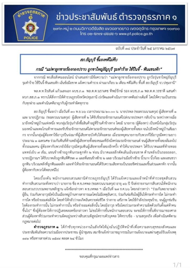 จากกรณี พบสื่อสังคมออนไลน์ นำเสนอข่าวมีข้อความว่า “แม่พาลูกชายร้องกองปราบปราม ถูกวัยรุ่นขาใหญ่ธัญบุรี