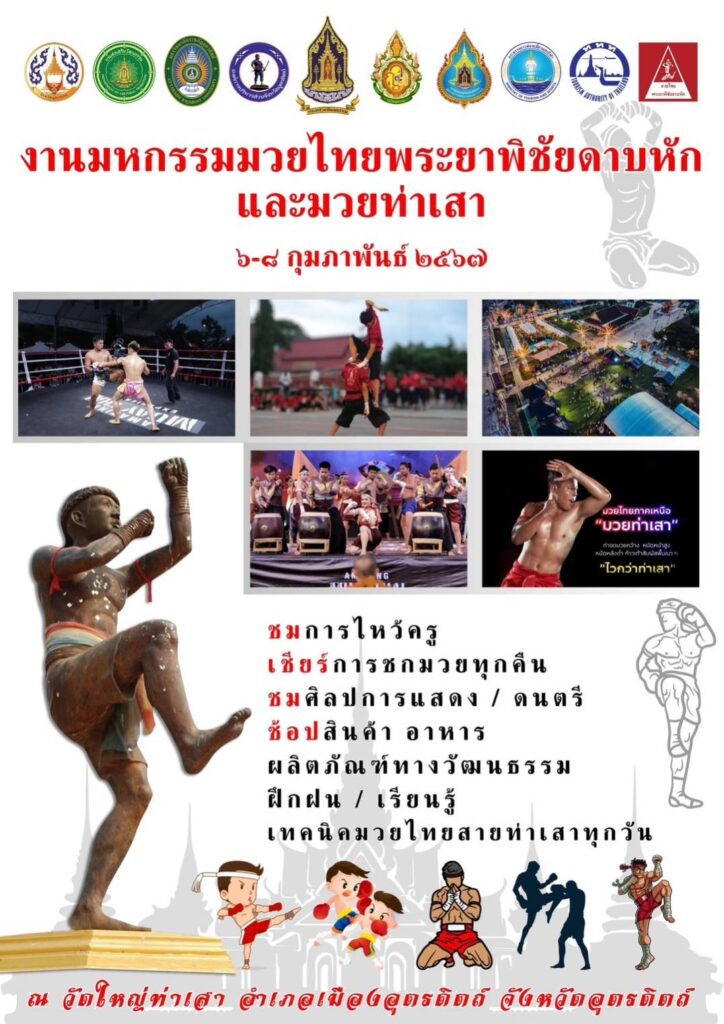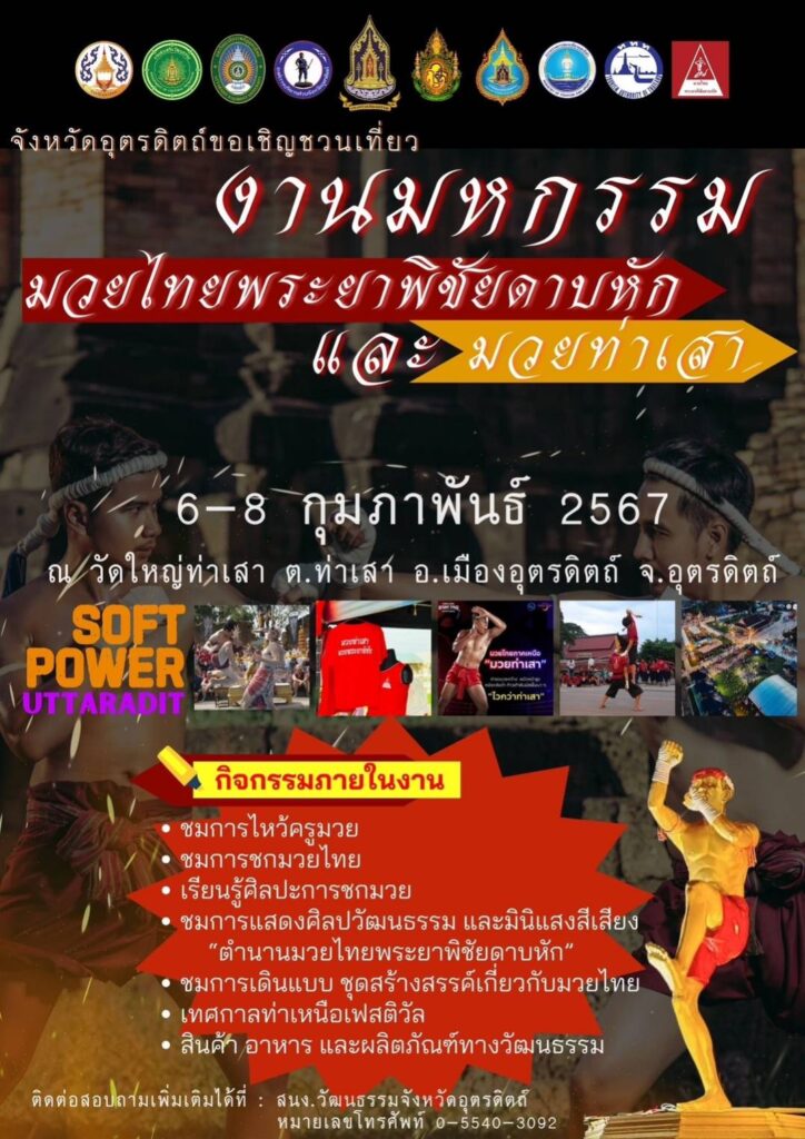 จังหวัดอุตรดิตถ์ โดยสำนักงานวัฒนธรรมจังหวัดอุตรดิตถ์ ร่วมกับสภาวัฒนธรรมจังหวัดอุตรดิตถ์ องค์การบริหารส่วนจังหวัดอุตรดิตถ์, มหาวิทยาลัยราชภัฏอุตรดิตถ์, สำนักงานท่องเที่ยวและกีฬาจังหวัดอุตรดิตถ์ และสำนักงานการท่องเที่ยวแห่งประเทศไทย (ททท.) สำนักงานแพร่ – อุตรดิตถ์ กำหนดจัดงานมหกรรมมวยไทยพระยาพิชัยดาบหักและมวยท่าเสา ระหว่างวันที่ 6 – 8 กุมภาพันธ์ 2567ณ วัดใหญ่ท่าเสา ตำบลท่าเสา อำเภอเมือง จังหวัดอุตรดิตถ์ เพื่อเทิดพระเกียรติและน้อมรำลึกถึงพระมหากรุณาธิคุณของสมเด็จพระสรรเพชญ์ ที่ 8 (พระเจ้าเสือ) ที่ทรงพระปรีชาสามารถด้านมวยไทย รวมทั้ง เพื่อสืบสาน รักษา และพัฒนาต่อยอดมรดกภูมิปัญญาด้านมวยไทยพระยาพิชัยดาบหักและมวยท่าเสา และเพื่อพัฒนาสู่ soft power ส่งเสริมการท่องเที่ยว สร้างรายได้ให้กับประชาชนและชุมชนคนอุตรดิตถ์