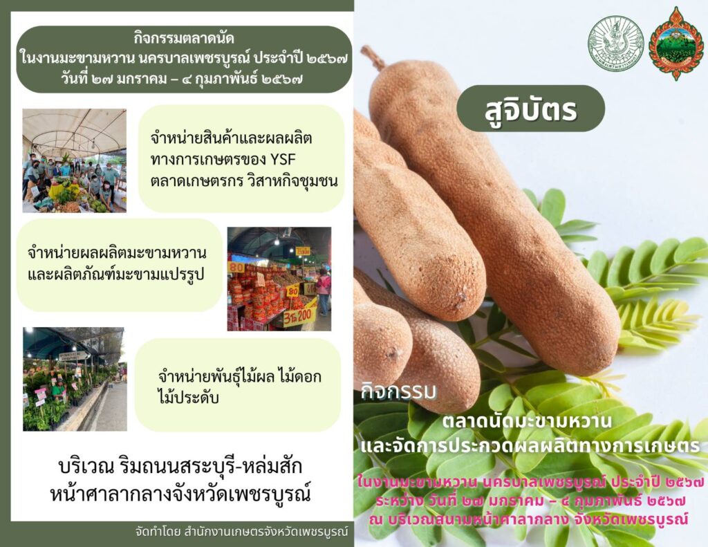 29 มกราคม 2567 ตั้งแต่เวลา 10.00 น มีการประกวดผลผลิตมะขามหวาน และเสวนา”การขับเคลื่อนมะขามหวานเพชรบูรณ์” ชมตลาดสินค้าเกษตรของกลุ่มตลาดเกษตรกรและกลุ่ม Young Smart Farmer จังหวัดเพชรบูรณ์ สัมภาษณ์เกษตรกร ผู้ที่ได้รับรางวัล