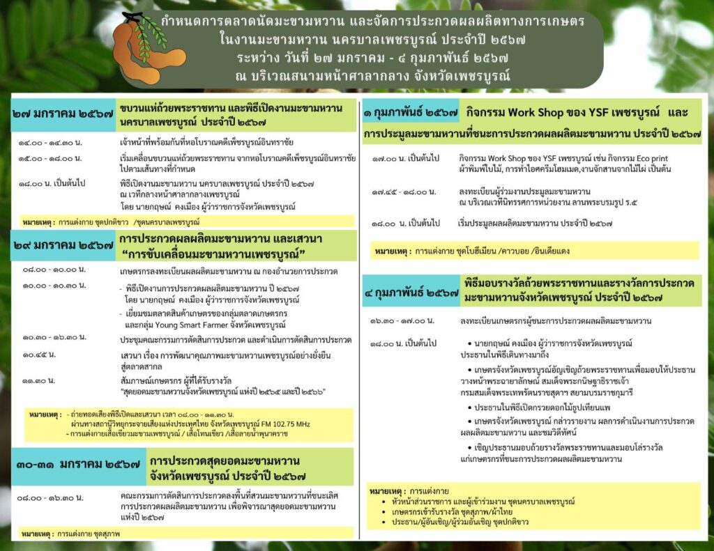 ส่วนในวันที่ 30-31 มกราคม จะมีกิจกรรมการประกวดสุดยอดมะขามหวานจังหวัดเพชรบูรณ์ ประจำปี 2567