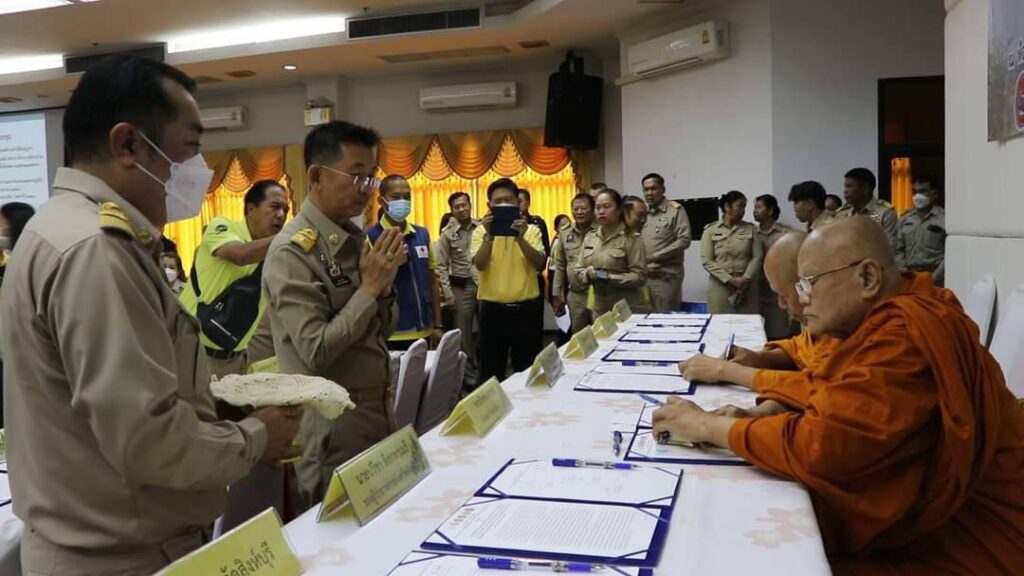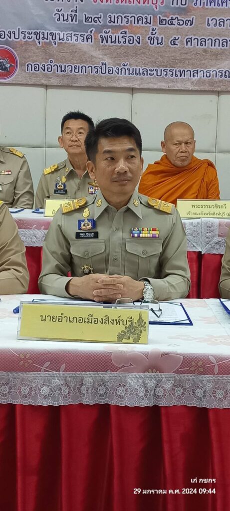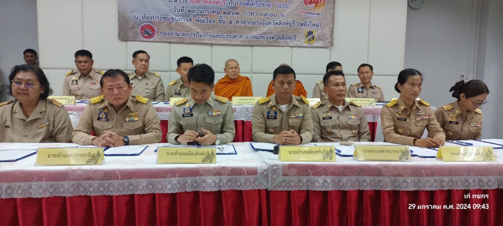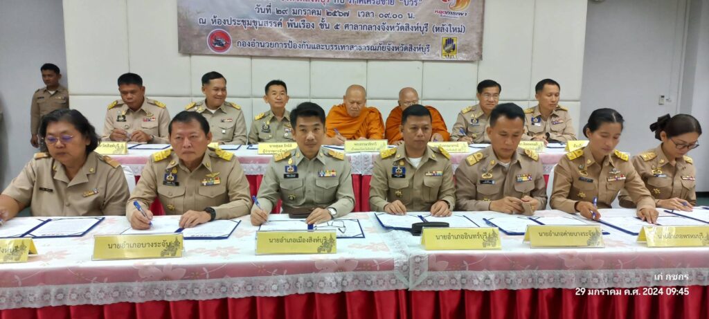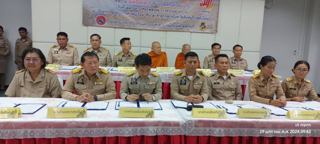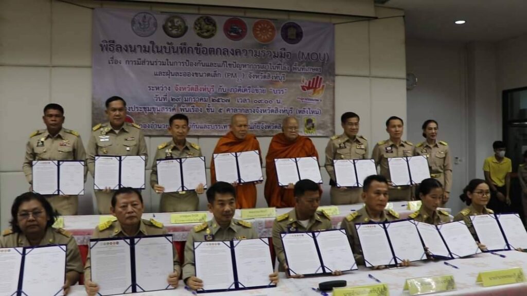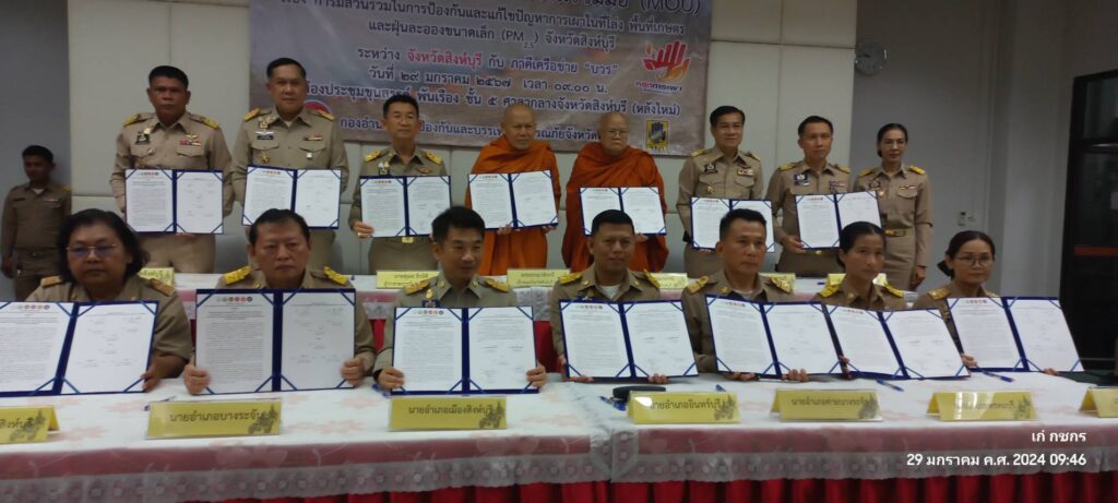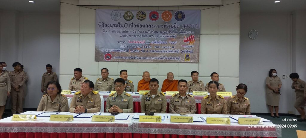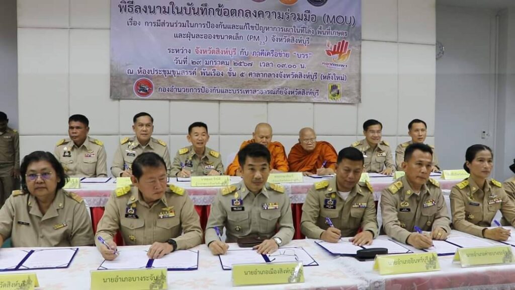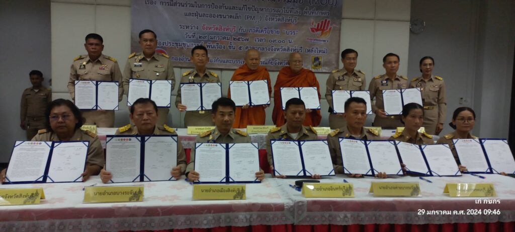 วันที่ 29 มกราคม 2567 เวลา 9.00 น.นายสุเมธ ธีรนิติ ผู้ว่าราชการจังหวัดสิงห์บุรี เป็นประธานในพิธีลงนามบันทึกข้อตกลงความร่วมมือ(MOU) เรื่องการมีส่วนร่วมในการป้องกันและแก้ไขปัญหาการเผาในที่โล่งพื้นที่เกษตรและฝุ่นละอองขนาดเล็ก(PM 2.5) ณ ห้องประชุมขุนสรรค์ พันเรือง ชั้น 5 ศาลกลางจังหวัดสิงห์บุรี โดยมี เจ้าคณะจังหวัดสิงห์บุรี ฝ่ายมหานิกายกับฝ่ายธรรมยุตินิกาย ที่ทำการปกครองจังหวัดสิงห์บุรี ที่ว่าการอำเภอทั้ง 6 อำเภอ สำนักงานส่งเสริมการปกครองท้องถิ่นจังหวัดสิงห์บุรี สำนักงานเกษตรจังหวัดสิงห์บุรี และสำนักงานศึกษาธิการจังหวัดสิงห์บุรี ภาคีเครือข่าย บวร บ้าน วัด โรงเรียน ลงนามบันทึกข้อตกลงความร่วมมือ MOU เพื่อแสดงเจตนารมณ์ร่วมกันในการป้องกันและแก้ไขปัญหาการเผาในที่โล่ง ให้มีความเข้มข้นมากยิ่งขึ้นเพื่อให้สถานการณ์ปัญหาและผลกระทบที่เกิดขึ้นกลับมาสู่ภาวะปกติโดยเร็ว ทุกภาคีเครือข่ายจะต้องให้ความสำคัญร่วมกันรณรงค์และปฏิบัติภารภิจ ในการบริหารจัดการเชื้อเพลิง ชิงเก็บ ลดเผา การนำไปใช้ประโยชน์ของวัสดุที่เหลือใช้ทางการเกษตร วัชพืช ใบไม้ กิ่งไม้ ตั้งแต่ในช่วงกลางฤดูหนาวจนกระทั่งเข้าสู่ฤดูฝนถัดไปอย่างจริงจัง