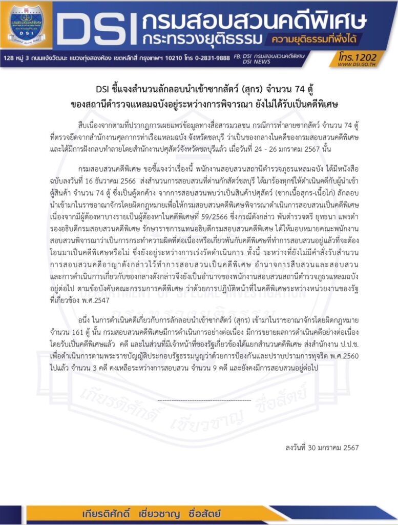 กรมสอบสวนคดีพิเศษ ขอชี้แจงว่าเรื่องนี้ พนักงานสอบสวนสถานีตำรวจภูธรแหลมฉบัง ได้มีหนังสือฉบับลงวันที่ 16 ธันวาคม 2566 ส่งสำนวนการสอบสวนที่ด่านกักสัตว์ชลบุรี ได้มาร้องทุกข์ให้ดำเนินคดีกับผู้นำเข้าตู้สินค้า จำนวน 74 ตู้ ซึ่งเป็นตู้ตกค้าง จากการสอบสวนพบว่าเป็นสินค้าปศุสัตว์ (ซากเนื้อสุกร-เนื้อไก่) ลักลอบนำเข้ามาในราชอาณาจักรโดยผิดกฎหมายเพื่อให้กรมสอบสวนคดีพิเศษพิจารณาดำเนินการสอบสวนเป็นคดีพิเศษเนื่องจากมีผู้ต้องหาบางรายเป็นผู้ต้องหาในคดีพิเศษที่ 59/2566 ซึ่งกรณีดังกล่าว พันตำรวจตรี ยุทธนา แพรดำ รองอธิบดีกรมสอบสวนคดีพิเศษ รักษาราชการแทนอธิบดีกรมสอบสวนคดีพิเศษ ได้ให้มอบหมายคณะพนักงานสอบสวนพิจารณาว่าเป็นการกระทำความผิดที่ต่อเนื่องหรือเกี่ยวพันกับคดีพิเศษที่ทำการสอบสวนอยู่แล้วที่จะต้องโอนมาเป็นคดีพิเศษหรือไม่ ซึ่งยังอยู่ระหว่างการเร่งรัดดำเนินการ ทั้งนี้ ระหว่างที่ยังไม่มีคำสั่งรับสำนวนการสอบสวนคดีอาญาดังกล่าวไว้ทำการสอบสวนเป็นคดีพิเศษ อำนาจการสืบสวนและสอบสวนและการดำเนินการเกี่ยวกับของกลางดังกล่าวจึงยังเป็นอำนาจของพนักงานสอบสวนสถานีตำรวจภูธรแหลมฉบังอยู่ต่อไป ตามข้อบังคับคณะกรรมการคดีพิเศษ ว่าด้วยการปฏิบัติหน้าที่ในคดีพิเศษระหว่างหน่วยงานของรัฐที่เกี่ยวข้อง พ.ศ.2547