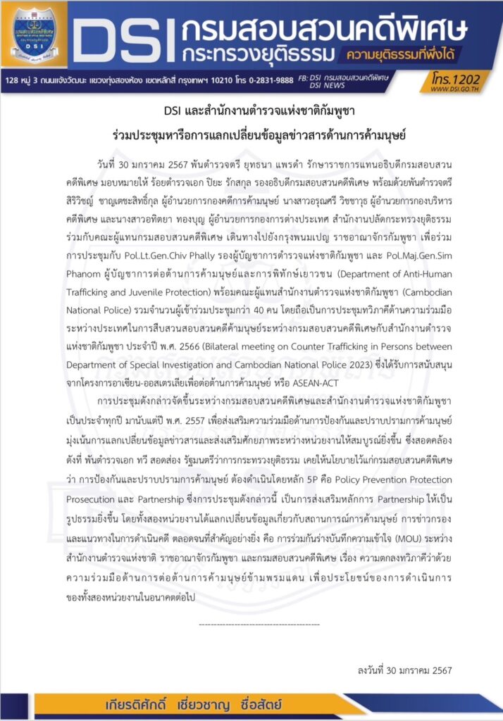 วันที่ 30 มกราคม 2567 พันตำรวจตรี ยุทธนา แพรดำ รักษาราชการแทนอธิบดีกรมสอบสวนคดีพิเศษ มอบหมายให้ ร้อยตำรวจเอก ปิยะ รักสกุล รองอธิบดีกรมสอบสวนคดีพิเศษ พร้อมด้วยพันตำรวจตรี สิริวิชญ์ ชาญเตชะสิทธิ์กุล ผู้อำนวยการกองคดีการค้ามนุษย์,นางสาวอรุณศรี วิชชาวุธ ผู้อำนวยการกองบริหารคดีพิเศษ และนางสาวอทิตยา ทองบุญ ผู้อำนวยการกองการต่างประเทศ สำนักงานปลัดกระทรวงยุติธรรม ร่วมกับคณะผู้แทนกรมสอบสวนคดีพิเศษ เดินทางไปยังกรุงพนมเปญ ราชอาณาจักรกัมพูชา เพื่อร่วม การประชุมกับ Pol.Lt.Gen.Chiv Phally รองผู้บัญชาการตำรวจแห่งชาติกัมพูชา และ Pol.Maj.Gen.Sim Phanom ผู้บัญชาการต่อต้านการค้ามนุษย์และการพิทักษ์เยาวชน (Department of Anti-Human Trafficking and Juvenile Protection) พร้อมคณะผู้แทนสำนักงานตำรวจแห่งชาติกัมพูชา (Cambodian National Police) รวมจำนวนผู้เข้าร่วมประชุมกว่า 40 คน โดยถือเป็นการประชุมทวิภาคีด้านความร่วมมือระหว่างประเทศในการสืบสวนสอบสวนคดีค้ามนุษย์ระหว่างกรมสอบสวนคดีพิเศษกับสำนักงานตำรวจแห่งชาติกัมพูชา ประจำปี พ.ศ.2566 (Bilateral meeting on Counter Trafficking in Persons between Department of Special Investigation and Cambodian National Police 2023) ซึ่งได้รับการสนับสนุนจากโครงการอาเซียน-ออสเตรเลียเพื่อต่อต้านการค้ามนุษย์ หรือ ASEAN-ACT