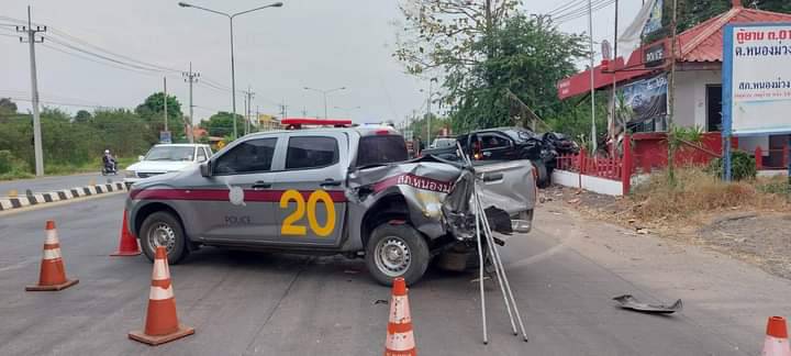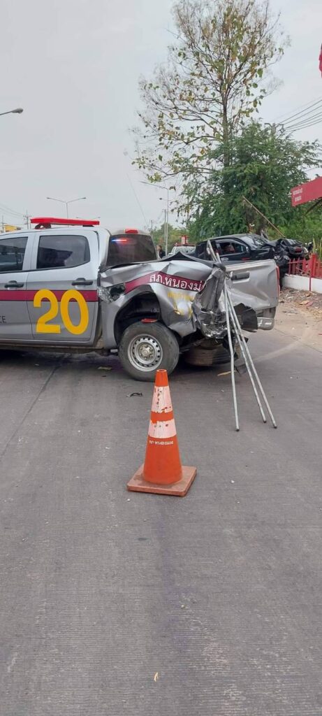 สภาพพังยับทั้งคันชนอัดติดกับป้อมยามสายตรวจ และรถกระบะตำรวจสายตรวจที่จอดอยู่ด้านหน้าพังยับเยินเช่นกัน โดยมีผู้บาดเจ็บเป็นชาย 4 ราย กู้ภัยช่วยเหลือปฐมพยาบาลเบื้องต้นก่อนนำส่งรพ.หนองม่วง