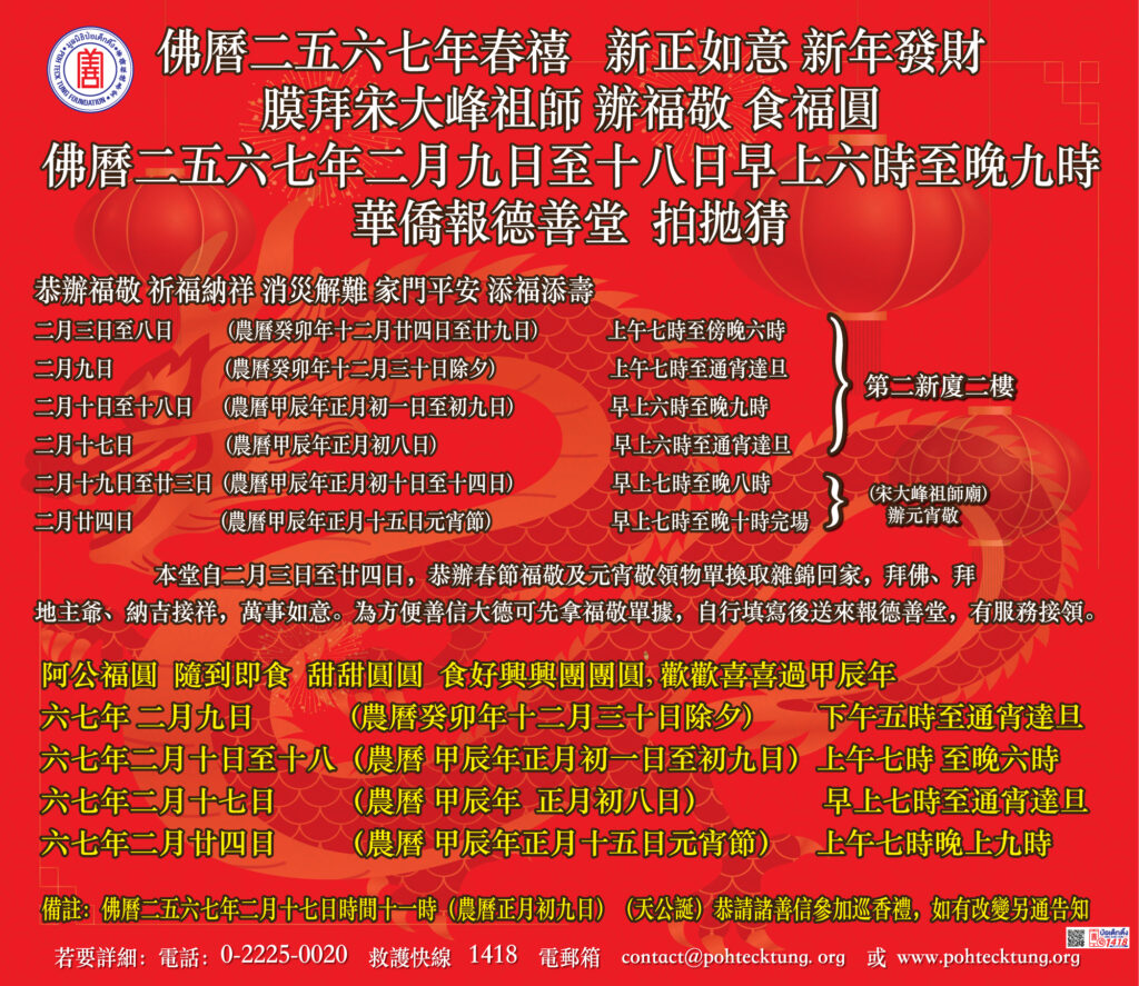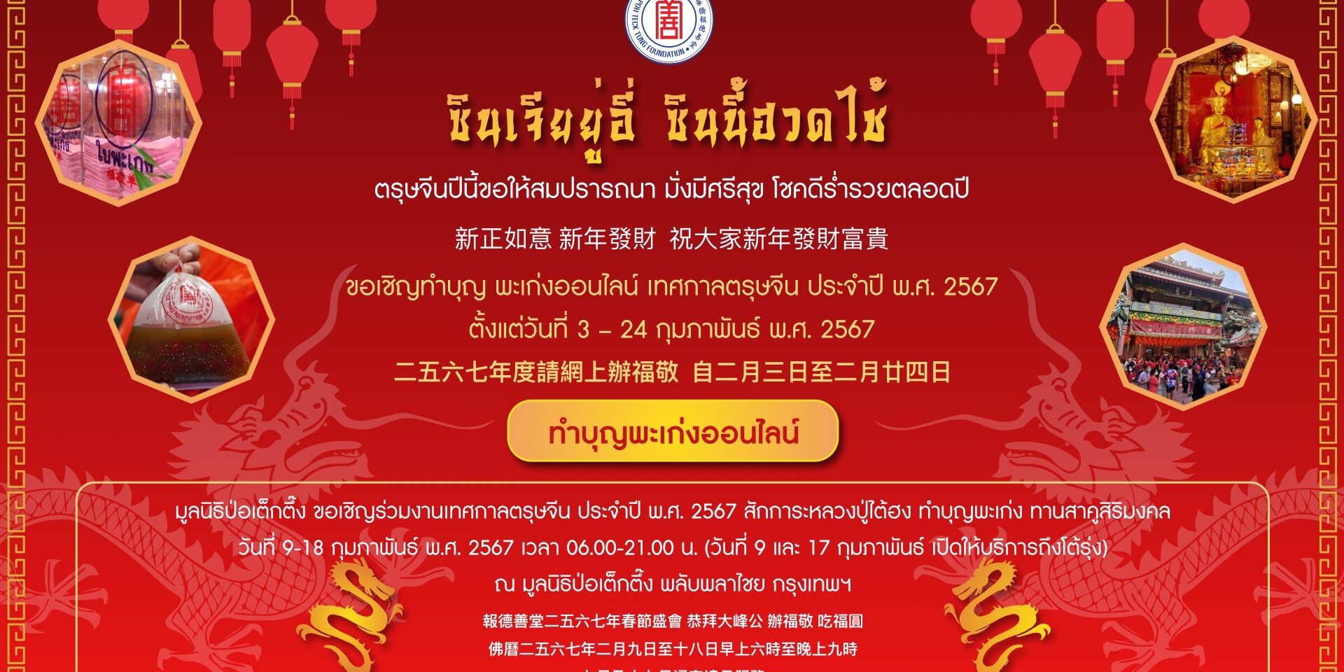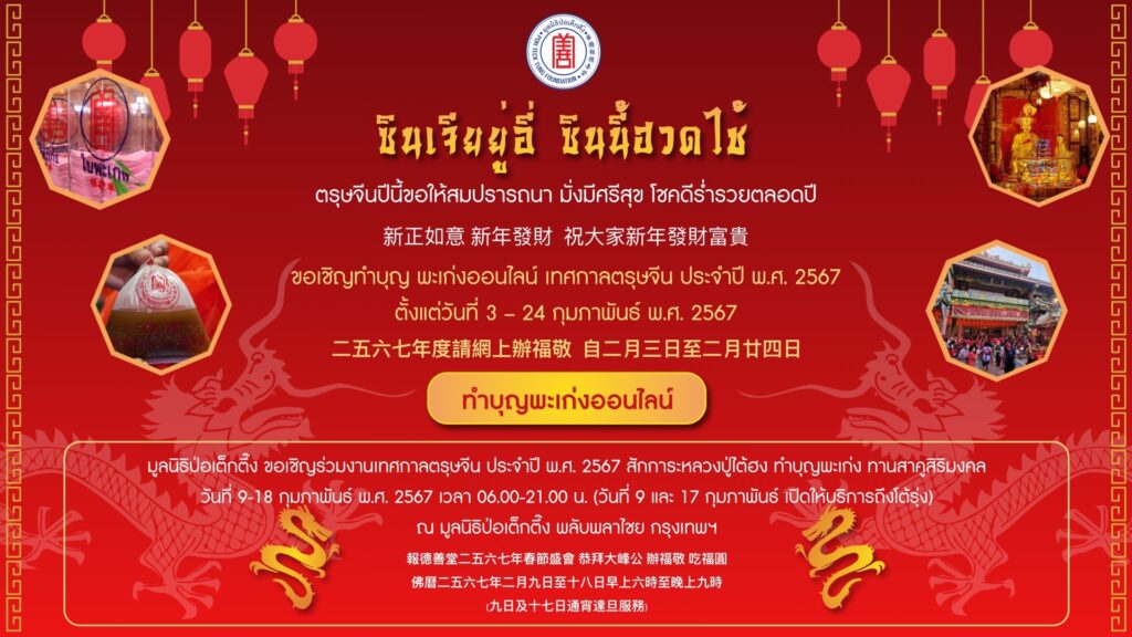 ระหว่างวันที่ 9 – 18 กุมภาพันธ์ 2567 มูลนิธิป่อเต็กตึ๊ง โดยนายวิเชียร เตชะไพบูลย์ ประธานกรรมการ ขอเชิญทุกท่าน ร่วม “สักการะหลวงปู่ไต้ฮง” ขอพรเนื่องในเทศกาลตรุษจีนเพื่อความเป็นสิริมงคลต้อนรับปีใหม่ ลงชื่อ สวดชัยมงคลคาถา หรือ “พะเก่ง” เพื่อสะเดาะเคราะห์ ขอให้ครอบครัวมีสุข เสริมโชคลาภ เสริมดวงชะตา เสริมความมั่นคงสถาพร ตลอดปี รวมถึงทำบุญสะเดาะเคราะห์และเสริมความเป็นสิริมงคลกับรูปปั้นนักษัตรปีมะโรง ซึ่งได้ผ่านการทำพิธีเบิกเนตรโดยพระอาจารย์จีนคณาณัติจีนพรต (เย็นงี้) เจ้าอาวาสวัดมังกรกมลาวาส (วัดเล่งเน่ยยี่) พร้อม รับประทาน “สาคูสิริมงคล” เพื่อความกลมเกลียวและอยู่เย็นเป็นสุข อัญเชิญ “ฮู้แดง” (ยันต์) ของหลวงปู่ไต้ฮง เพื่อนำไปประทับหน้าบ้าน เคหะสถาน หรือพกติดตัวเพื่อคุ้มครอง “เคาะระฆังทอง”ให้ก้องกังวานเพื่อให้ชีวิตสดใส การงานรุ่งเรืองระบือไกล และ ร่วม “พิธีเวียนธูปศักดิ์สิทธิ์” เพื่อขอพรเทพยดาฟ้าดินเนื่องในวันประสูติ (ทีกงแซ) ซึ่งในปีนี้ตรงกับวันเสาร์ที่ 17 กุมภาพันธ์ 2567 ขออำนาจฟ้าดินเป็นที่พึ่ง ขอให้สิ่งศักดิ์สิทธิ์ที่ตนนับถือ เช่น หลวงปู่ไต้ฮง ช่วยดลบันดาลให้ประสบโชคดีตลอดปีใหม่ (โดยในวันที่ 9 และ 17 กุมภาพันธ์ 2567 มูลนิธิป่อเต็กตึ๊ง เปิดบริการโต้รุ่ง)