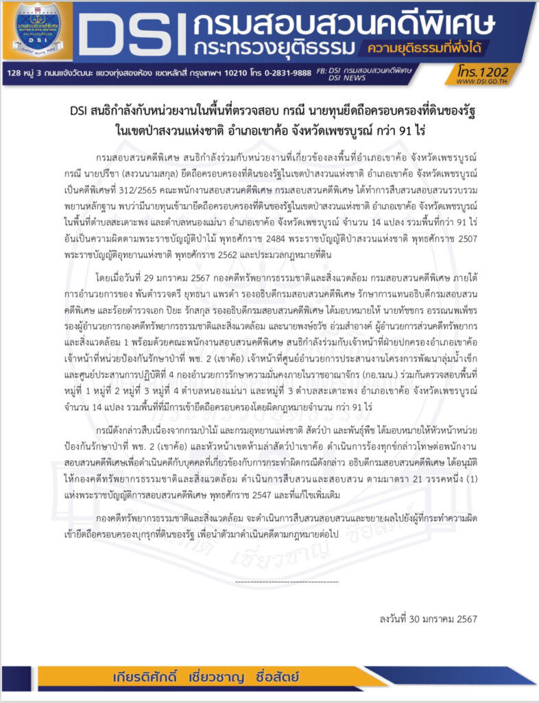 กรมสอบสวนคดีพิเศษ สนธิกำลังร่วมกับหน่วยงานที่เกี่ยวข้องลงพื้นที่อำเภอเขาค้อ จังหวัดเพชรบูรณ์ กรณี นายปรีชา (สงวนนามสกุล) ยึดถือครอบครองที่ดินของรัฐในเขตป่าสงวนแห่งชาติ อำเภอเขาค้อ จังหวัดเพชรบูรณ์เป็นคดีพิเศษที่ 312/2565 คณะพนักงานสอบสวนคดีพิเศษ กรมสอบสวนคดีพิเศษ ได้ทำการสืบสวนสอบสวนรวบรวมพยานหลักฐาน พบว่ามีนายทุนเข้ามายึดถือครอบครองที่ดินของรัฐในเขตป่าสงวนแห่งชาติ อำเภอเขาค้อ จังหวัดเพชรบูรณ์ ในพื้นที่ตำบลสะเดาะพง และตำบลหนองแม่นา อำเภอเขาค้อ จังหวัดเพชรบูรณ์ จำนวน 14 แปลง รวมพื้นที่กว่า 91 ไร่อันเป็นความผิดตามพระราชบัญญัติป่าไม้ พุทธศักราช 2484 พระราชบัญญัติป่าสงวนแห่งชาติ พุทธศักราช 2507 พระราชบัญญัติอุทยานแห่งชาติ พุทธศักราช 2562 และประมวลกฎหมายที่ดิน