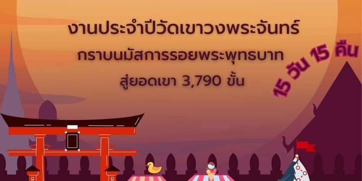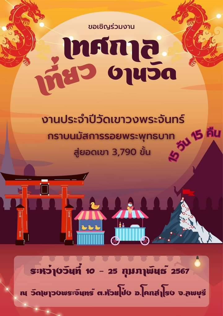 การท่องเที่ยวแห่งประเทศไทย (ททท.) สำนักงานลพบุรี ขอเชิญร่วมงาน “เทศกาลงานวัดเขาวงพระจันทร์” นมัสการรอยพระพุทธบาท และหลวงพ่อพุทธโชค ในระหว่างวันที่ 10 – 25 กุมภาพันธ์ 2567 (15 วัน 15 คืน) ณ วัดเขาวงพระจันทร์ ตำบลห้วยโป่ง อำเภอโคกสำโรง จังหวัดลพบุรี