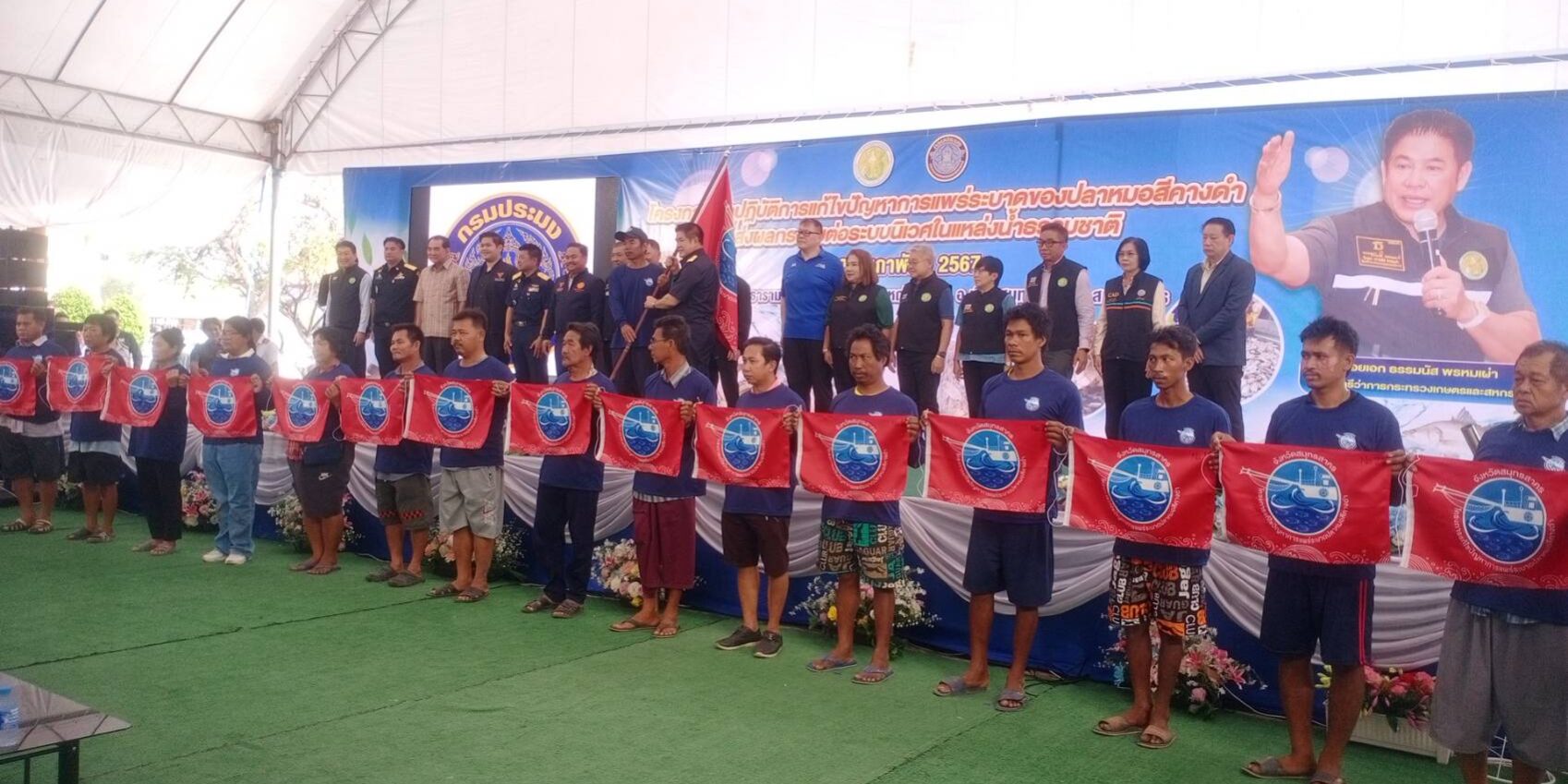 ภายในงานมีการมอบธงสัญลักษณ์ให้แก่ชาวประมงเรืออวนรุนที่ได้ขึ้นทะเบียนไว้กับสำนักงานประมงจังหวัด ทั้งหมด 23 ราย และปล่อยขบวนเรืออวนรุนที่เข้าร่วมโครงการฯ เพื่อปฏิบัติการในแม่น้ำท่าจีน พร้อมสาธิตวิธีการใช้อวนรุนในการกำจัดปลาหมอสีคางดำ โดยรัฐมนตรีว่าการกระทรวงเกษตรและสหกรณ์ได้ออกประกาศกระทรวงเกษตรและสหกรณ์ ผ่อนผันให้ใช้อวนรุนขนาดคันรุนยาวไม่เกิน 16 เมตร ห้ามติดโช่แต่ให้มีการถ่วงน้ำหนักได้ด้วยการติดตัวถ่วงน้ำหนักที่แนบกับเชือกคร่าวล่าง ขนาดตาอวนตลอดผืน ต้องไม่น้อยกว่า 3 เซนติเมตร ในการกำจัดปลาหมอสีคางดำเฉพาะในพื้นที่จังหวัดสมุทรสาคร ได้แก่ พื้นที่บริเวณริมทะเลชายฝั่งจังหวัดสมุทรสาคร พื้นที่บริเวณปากแม่น้ำท่าจีน คลองสุนัขหอน และคลองพิทยาลงกรณ์เท่านั้นโดยจะต้องอยู่ภายใต้การควบคุมกำกับดูแลของเจ้าหน้าที่ และมีผลบังคับใช้ตั้งแต่วันที่ 26 มกราคม และ สิ้นสุดในวันที่ 31 ธันวาคม 2567 ตามประกาศกรมประมงเรื่อง กำหนดชนิดเครื่องมือ รูปแบบของเครื่องมือ ขนาดเรือ วิธีการทำการประมง พื้นที่ทำการประมง และเงื่อนไข ที่อนุญาต ผ่อนผันให้ใช้ทำการประมง พ.ศ. 2567