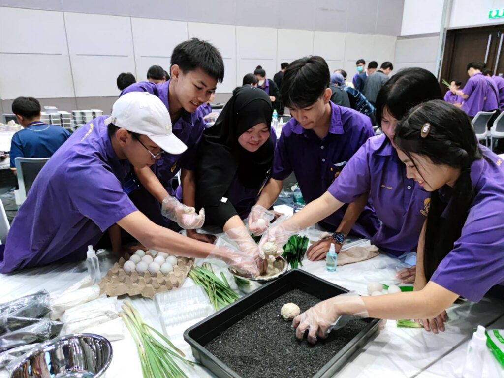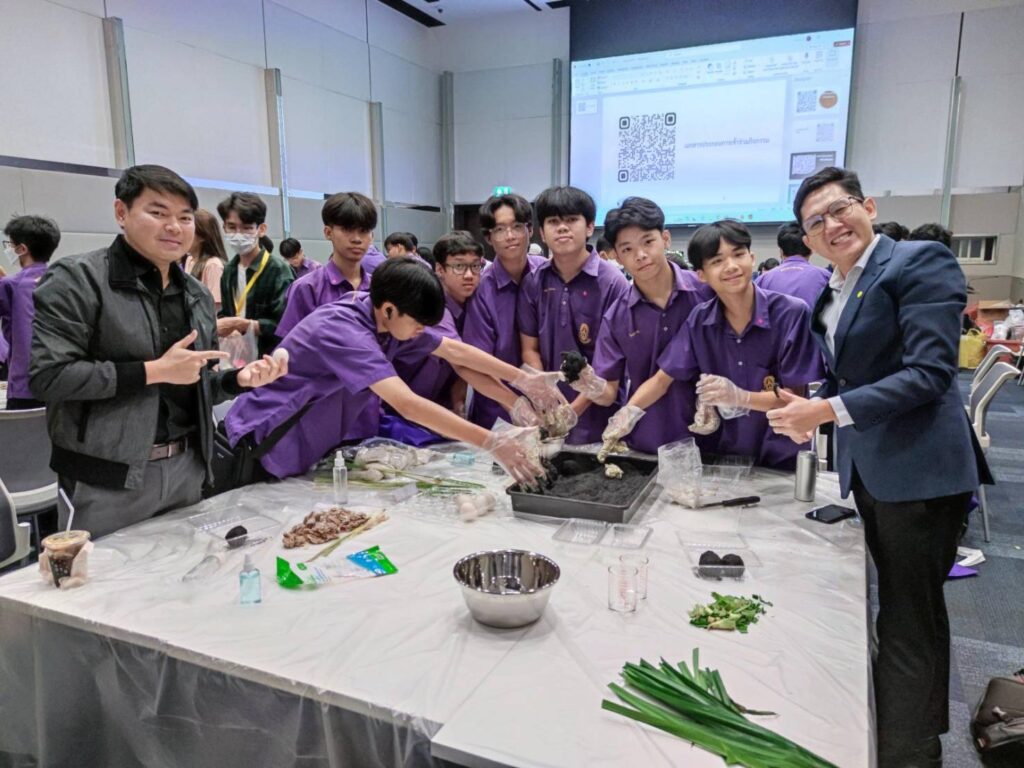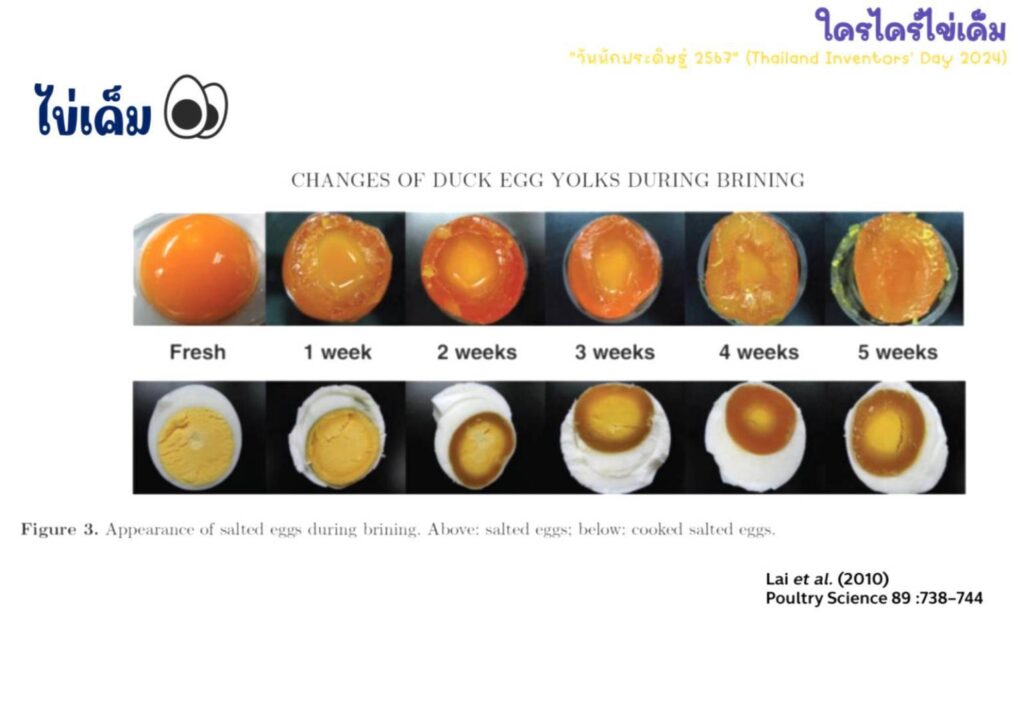 ณ ห้อง NILE 1 : (วช.) ร่วมกับ คณะเกษตร มหาวิทยาลัยเกษตรศาสตร์ จัดเวิร์กชอป เรื่อง “ใครไคร้ไข่เค็ม” มีเยาวชนและผู้เข้าร่วมกว่า 50 คน โดย ผศ.ทัศไนย จารุวัฒนพันธ์ ภาควิชาพืชสวน คณะเกษตร มหาวิทยาลัยเกษตรศาสตร์ กล่าวว่า การทำไข่เค็มเป็นการถนอมอาหารโดยใช้เกลือเพื่อทำให้เก็บรักษาไข่ได้นานขึ้น โดยการดองในน้ำเกลือที่ความเข้มข้น 20-35% หรือด้วยการพอกซึ่งเป็นวิธีที่มาจากประเทศจีน โดยใช้ดินผสมกับน้ำเกลือเข้มข้น 25-30% ดินจอมปลวก ดินเหนียว และดินสอพอง แล้วนำมาผสมเกลือในอัตราส่วน 4:1, 5:2 และ 3:1 เกลือจะออสโมซิสผ่านไปยังไข่ขาว จากนั้นน้ำในไข่แดงจะออกมาในส่วนของไข่ขาว ไข่ขาวจะมีลักษณะเหลวขึ้น (หนืดน้อยลง) และมีความเค็ม ในส่วนไข่แดงมีน้ำลดลง เกิดปฏิกิริยาของโปรตีนในไข่แดงทำให้สีเข้มและสดขึ้น เพื่อเพิ่มความเป็นเอกลักษณ์ของผลิตภัณฑ์ไข่เค็ม สามารถนำสมุนไพรและเครื่องเทศชนิดต่างๆ ที่มีกลิ่นหอมนำมาผสมกับวัสดุพอกหรือดองไข่เพื่อให้กลิ่นแทรกเข้าไปยังไข่ขาว เช่น ใบเตย ตะไคร้บ้าน เป็นต้น การทำไข่เค็ม “ใครไคร้ไข่เค็ม” ส่วนผสมประกอบด้วย ไข่เป็ด 10 ฟอง เกลือ 200 กรัม น้ำสะอาด 200 มิลลิลิตร ดินสอพอง 600 กรัม ตะไคร้หั่น 50 กรัม ใบเตยหั่น 50 กรัม และ แกลบเผา โดยขั้นตอนเริ่มจาก หั่นตะไคร้และใบเตยนำไปปั่นกับน้ำสะอาดและเกลือให้ละเอียด จากนั้นนำของเหลวที่ปั่นแล้วมาผสมกับดินสอพองทีละน้อยจนเนื้อดินละเอียด เช็ดเปลือกไข่ให้สะอาดแล้วนำไปเคลือบด้วยดินสอพองที่ผสมแล้ว จากนั้นนำไปคลุกกับแกลบเผาเพื่อรักษาความชื้นและกันไม่ให้เกลือออกมาที่ผิวมากเกินไป เก็บรักษาที่อุณหภูมิห้องประมาณ 12-30 วัน จึงนำมาประกอบอาหารรับประทานได้