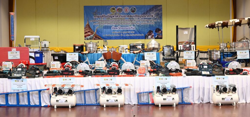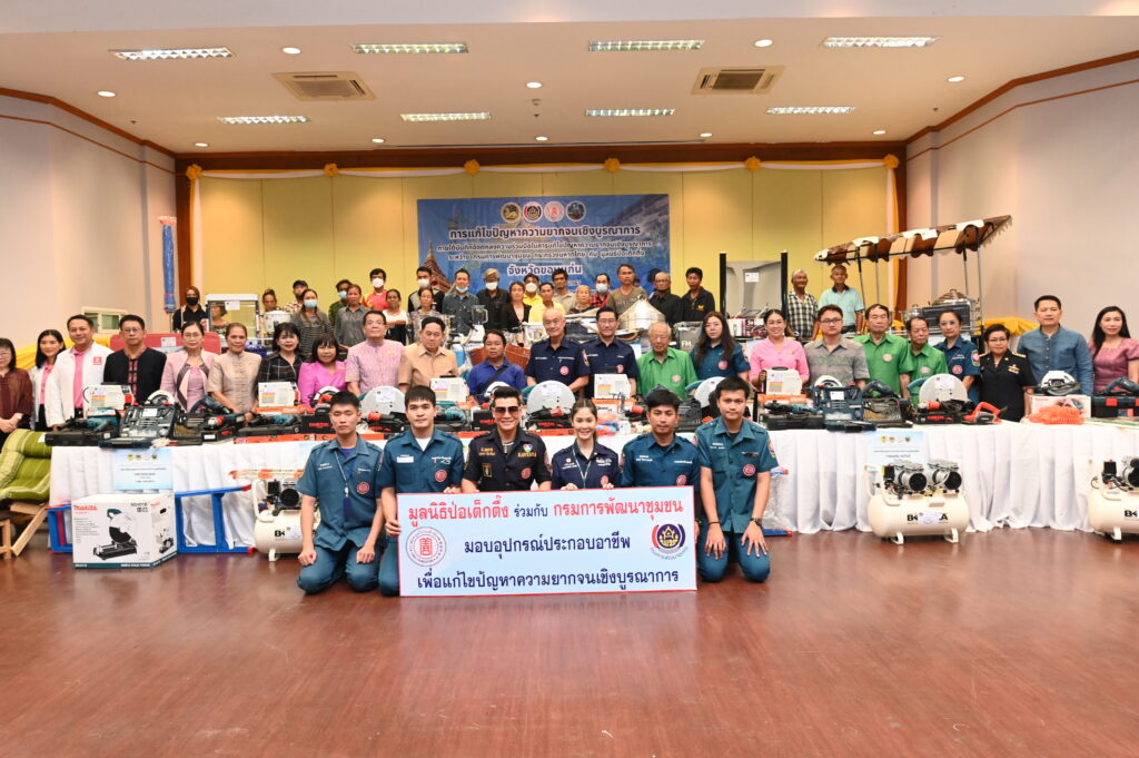 โครงการแก้ไขปัญหาความยากจนเชิงบูรณาการ มูลนิธิป่อเต็กตึ๊ง ได้สนับสนุนอุปกรณ์ประกอบอาชีพ ช่วยเหลือครัวเรือนยากจน ตามบันทึกข้อตกลงความร่วมมือแก้ไขปัญหาความยากจน ระหว่างกรมการพัฒนาชุมชนและมูลนิธิป่อเต็กตึ๊ง ซึ่งมูลนิธิฯ ได้จัดงบประมาณดำเนินการเพื่อจัดหาวัสดุอุปกรณ์การประกอบอาชีพมอบให้แก่ครัวเรือนยากจน ให้สามารถประกอบอาชีพเลี้ยงตนเองและครอบครัว โดยในกลุ่มเป้าหมายแรกดำเนินการในพื้นที่ภาคกลาง 17 จังหวัด รวม 98 ครัวเรือน ต่อมา ได้ดำเนินการในพื้นที่จังหวัดทางภาคเหนือ 17 จังหวัด รวม 230 ครัวเรือน ซึ่งได้ดำเนินการเป็นที่เรียบร้อยแล้ว และในขณะได้พิจารณาพื้นที่ภาคตะวันออกเฉียงเหนือ รวม 20 จังหวัด ประกอบด้วย จังหวัดบุรีรัมย์ สุรินทร์ กาฬสินธุ์ ชัยภูมิ นครราชสีมา อุดรธานี มุกดาหาร หนองบัวลำภู บึงกาฬ ยโสธร ศรีสะเกษ มหาสารคาม ขอนแก่น อุบลราชธานี ร้อยเอ็ด อำนาจเจริญ สกลนคร เลย หนองคาย และ นครพนม ซึ่งปัจจุบันทางมูลนิธิป่อเต็กตึ๊งได้ลงพื้นที่มอบไปแล้วรวมทั้งสิ้น 9 จังหวัด 212 ครัวเรือน คิดเป็นมูลค่าทั้งสิ้น 4,394,115 บาท (สี่ล้านสามแสนเก้าหมื่นสี่พันหนึ่งร้อยสิบห้าบาทถ้วน)