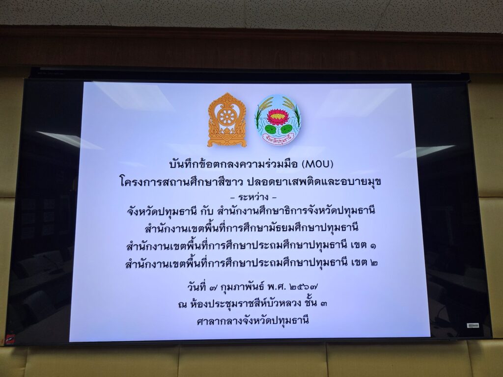 วันที่ 7 กุมภาพันธ์ 2567 ที่ศาลากลางจังหวัดปทุมธานี ต.บางปรอก อ.เมือง จ.ปทุมธานี นายภาสกร บุญญลักษม์ ผู้ว่าราชการจังหวัดปทุมธานี เป็นประธานในพิธีลงนามบันทึกข้อตกลงความร่วมมือ (MOU) เป็นภาคีเครือข่ายโครงการสถานศึกษาสีขาว ปลอดยาเสพติดและอบายมุข ระหว่างจังหวัดปทุมธานี กับศึกษาธิการจังหวัด สำนักงานเขตพื้นที่การศึกษามัธยมศึกษาปทุมธานี สำนักงานเขตพื้นที่การศึกษาประถมศึกษาปทุมธานีเขต 1 และสำนักงานเขตพี่การศึกษาประถมศึกษาปทุมธานี เขต 2 โดยมีเจ้าหน้าที่ และผู้เกี่ยวข้อง ร่วมเป็นสักขีพยาน