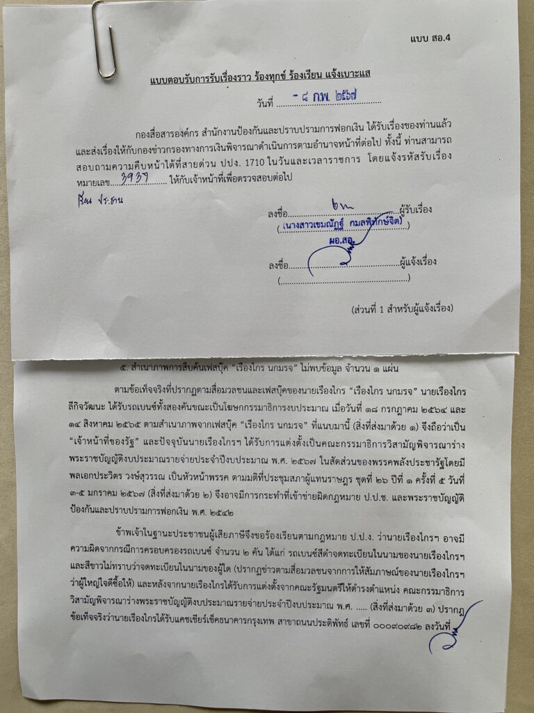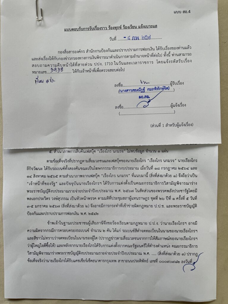 “…วัชระ ร้อง ป.ป.ง. สอบสวนเส้นทางการเงิน นายเรืองไกร ลีกิจวัฒนะ เป็นเจ้าหน้าที่ของรัฐ รับรถเบนซ์สองคัน และแคชเชียร์เช็คธนาคาร ๒๕ ล้านบาท ขณะเป็นโฆษกกรรมาธิการงบประมาณ เมื่อวันที่ ๑๘ กรกฎาคม ๒๕๖๔ และ ๑๔ สิงหาคม ๒๕๖๕ ถาม เสียภาษีกับกรมสรรพากรหรือไม่ รับจ้าวให้ใคร?…”