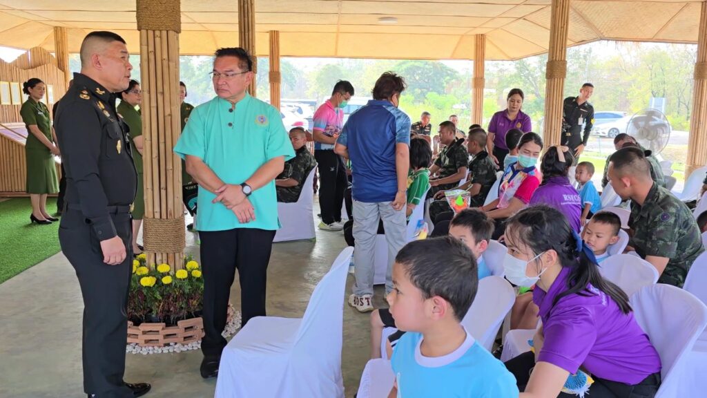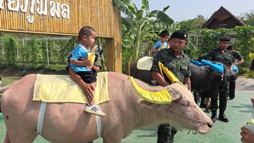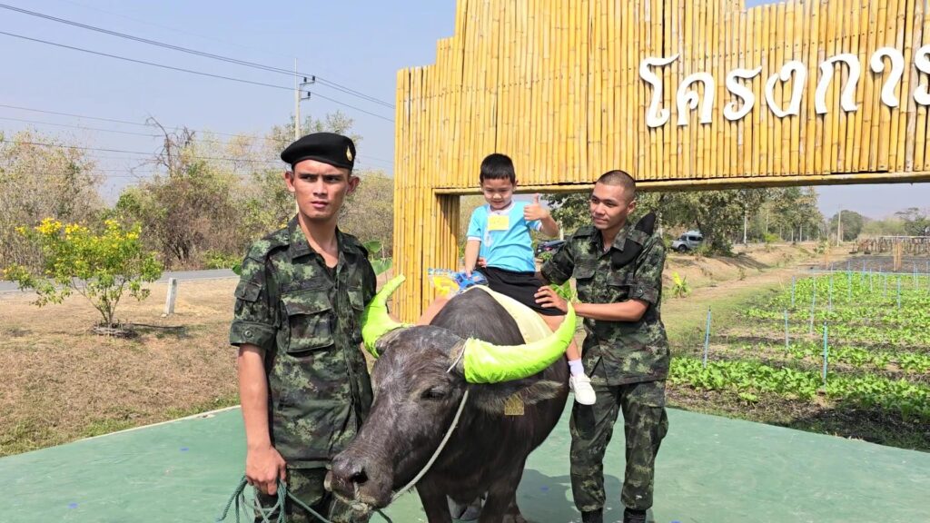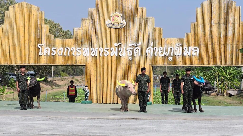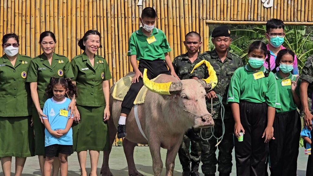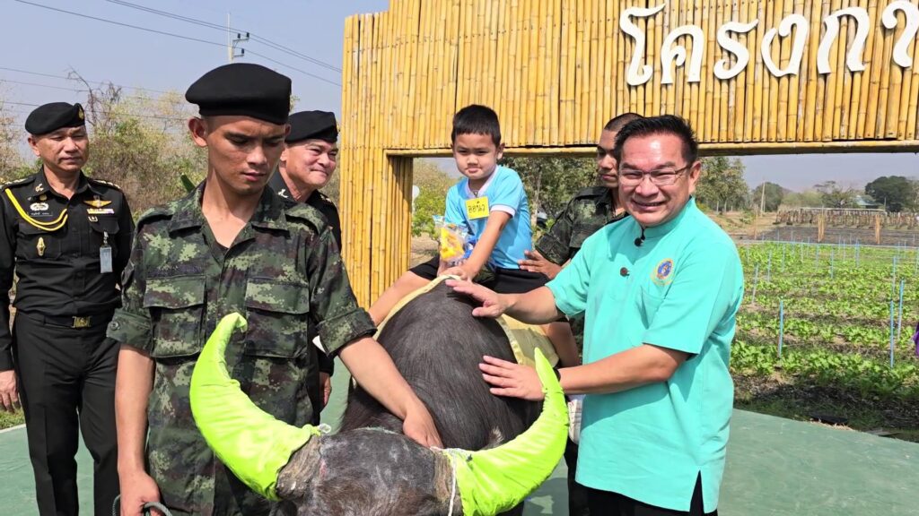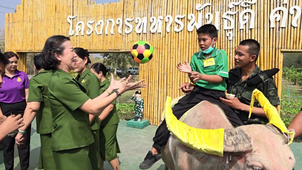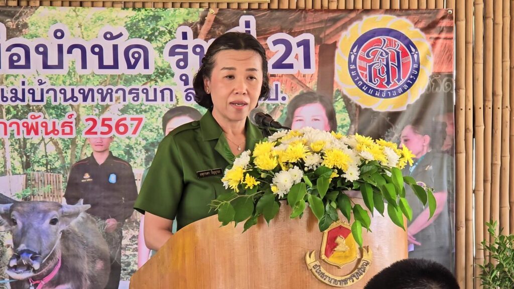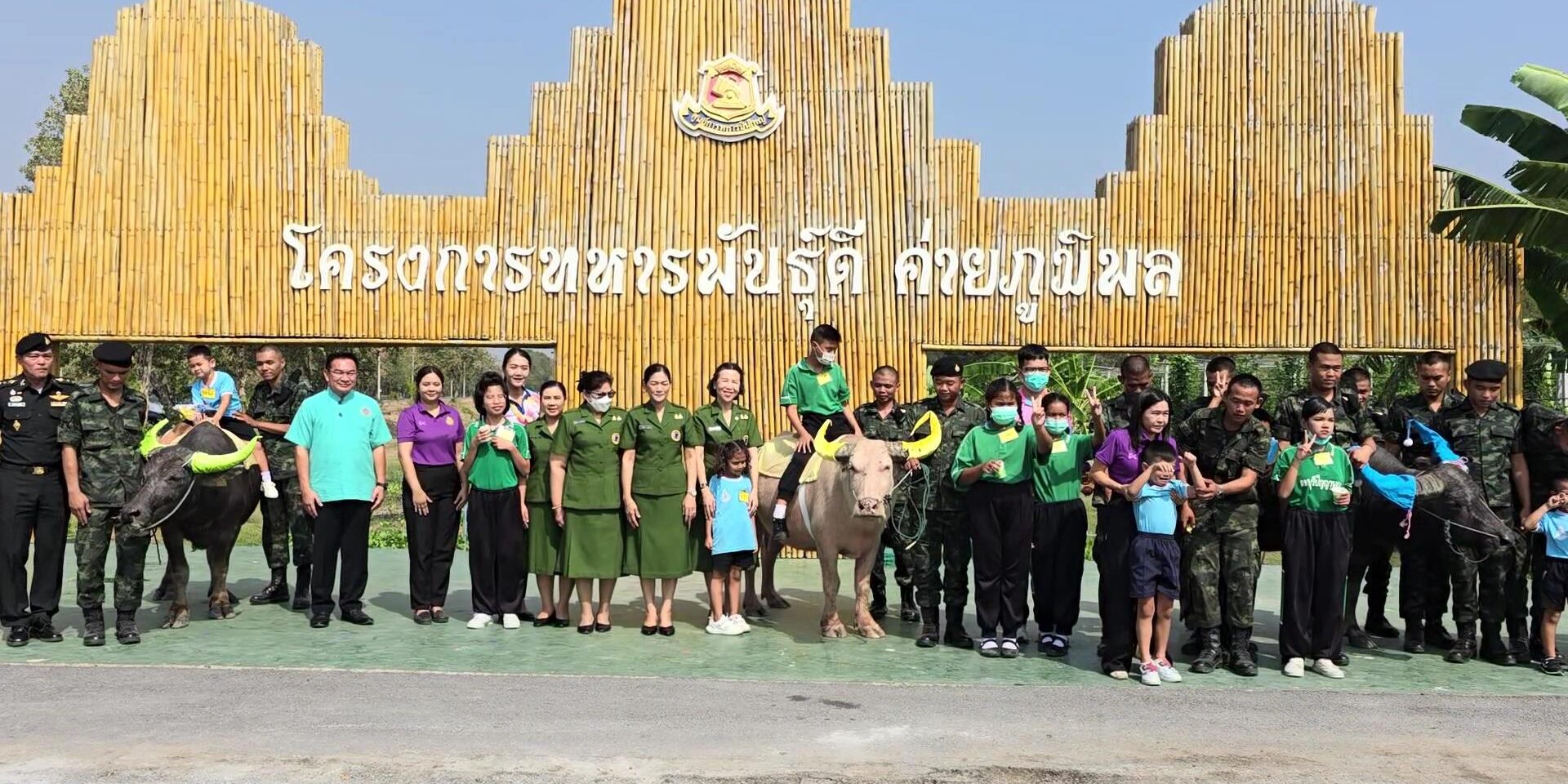 คุณ เกตุกานดา ปัญญานะ ประธานสมาคมแม่บ้านทหารบก สาขาศูนย์การทหารปืนใหญ่ เป็นประธานในพิธีเปิด โครงการกระบือบำบัด รุ่นที่ 21 ณ โครงการทหารพันธุ์ดี ศูนย์การทหารปืนใหญ่ ค่ายภูมิพล ต.เขาพระงาม จ.ลพบุรี