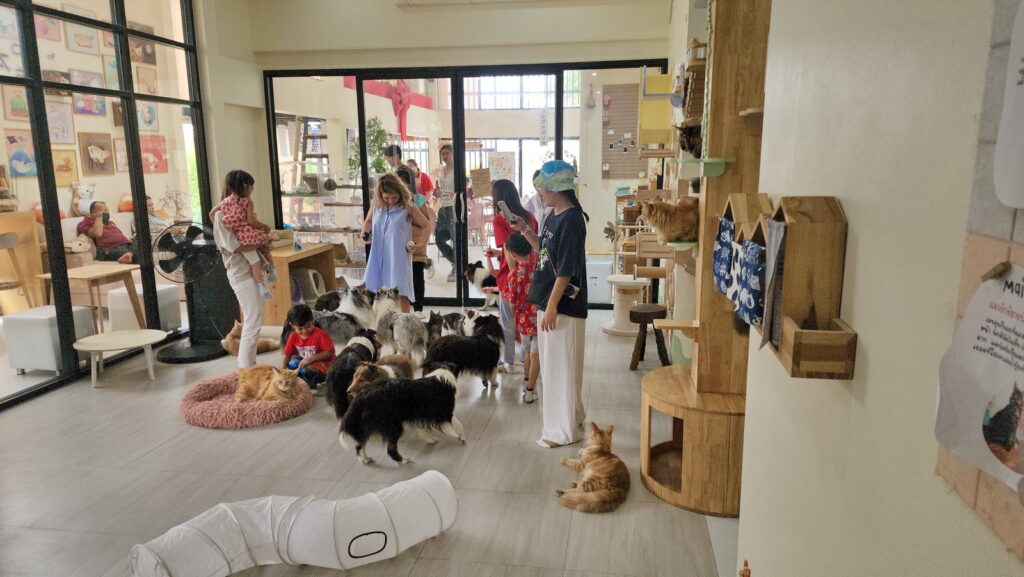 บรรยากาศภายในร้านเป็นร้านคาเฟ่ไตล์ญี่ปุ่น พร้อมสวนไม้ดัดสวนงาม และมุมเด็กเล่น พร้อมเมนูซิกเนเจอร์ของร้านที่ทุกคนมาต้องสั่งรับประทานคือ ข้าวหมา ข้าวแมว สูตรคนกิน เป็นเมนูน่ารักน่ารักแปลกๆ แต่อร่อย ใครที่ชอบสัตว์น่ารักสามารถเข้าในห้องสัตว์เลี้ยงจะมีน้องหมาและน้องแมวรวมถึงสุนัขจิ้งจอก คอยให้การตอนรับน้อง ๆ ทุกตัวนิสัยใจดี ชอบเลี้ยงกับทุกคน โดยมีพี่น้องคอยให้คำแนะนำอย่างเป็นกันเองภายในความปลอดภัย