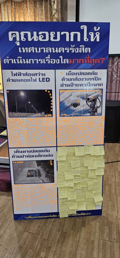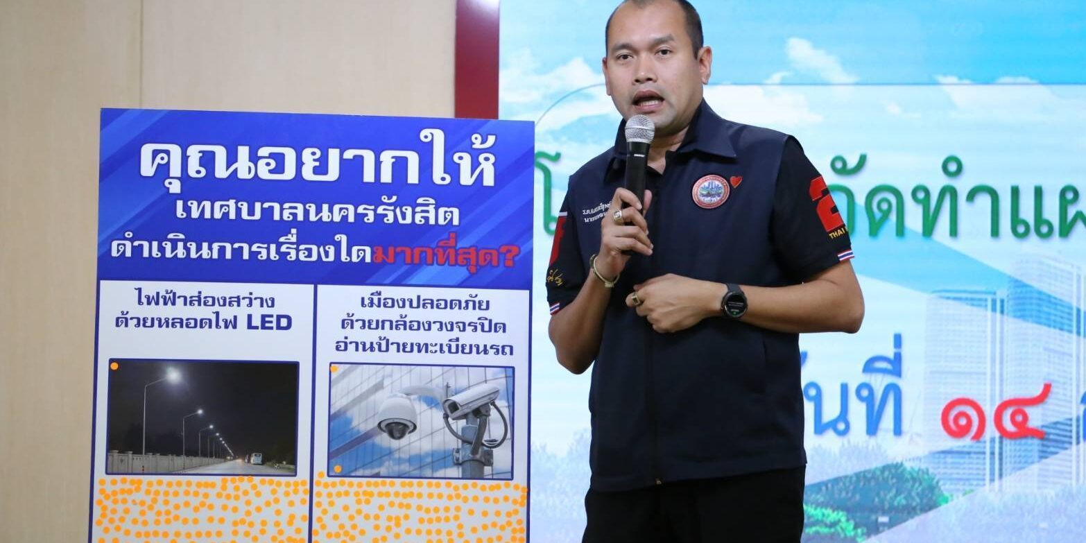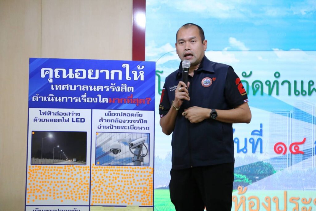 ด้าน ร้อยตำรวจเอก ดร.ตรีลุพธ์ ธูปกระจ่าง นายกเทศมนตรีนครรังสิต กล่าวว่า กองสวัสดิการสังคม เทศบาลนคร รังสิต ได้ดำเนินการจัดโครงการจัดทำแผนชุมชน เพื่อสนับสนุนการมีส่วนร่วมของประชาชน ในการพัฒนาท้องถิ่นโดยให้ความรู้สร้างความเข้มแข็งกับชุมชนในการจัดทำ ทบทวน และปรับปรุงแผนชุมชนให้สอดคล้องกับนโยบายรัฐบาล แผนพัฒนาเศรษฐกิจและสังคมแห่งชาติ แผนพัฒนาจังหวัด และนำแผนชุมชนไปจัดทำแผนพัฒนาเทศบาล ส่วนปัญหาหลักๆที่ทาง 82 ผู้นำชุมชนได้ประชุมวางแผนจนตกผลึก ไม่ว่าจะเป็นเรื่อง ไฟแอลอีดีส่องสว่าง ปรับปรุงฝาท่อที่ชำรุดมานาน โครงการถนนปลอยภัยด้วยกล้องวงจรปิด CCTV เป็นสิ่งที่เราตั้งใจที่จะเปลี่ยนแปลงนครรังสิต เพื่อคุณภาพชีวิตที่ดีขึ้นอยู่แล้วแต่ก่อนหน้านี้ทางสภาเทศบาลนครรังสิตก็ปัดตก ไม่อนุมัติ โดยยกเหตุผลในเรื่องของราคา มาเป็นข้อตีตกในการ ประชุมสภาเทศบาล สมัยสามัญ สมัยที่ 4 ครั้งที่ 2 ประจำปี พ.ศ. 2566 เมื่อ วันที่ 25 ธันวาคม 2566 ปีที่ผ่านมา ซึ่งงบประมาณที่เราใช้จากเงินสะสม เราได้กันเงินไว้ใช้ในสัดส่วนต่างๆเรียบร้อย ถึงร้อยกว่าล้าน ไม่กระทบต่อการบริหารแน่นอน รวมถึงเรามองถึงความเดือดร้อนเร่งด่วนกับประชาชนเป็นหลัก โดยมีการตรวจสอบราคาจากกรมบัญชีกลางและหน่วยงานอื่นๆของรัฐ สามารถตรวจสอบได้ เพื่อให้เกิดความคุ้มค่ากับประชาชนมากที่สุด ตามระเบียบกระทรวงมหาดไทยว่าด้วยการรับเงิน การเบิกจ่าย การฝากเงิน และการเก็บรักษาเงิน ขององค์การปกครองส่วนท้องถิ่น พ.ศ.2566