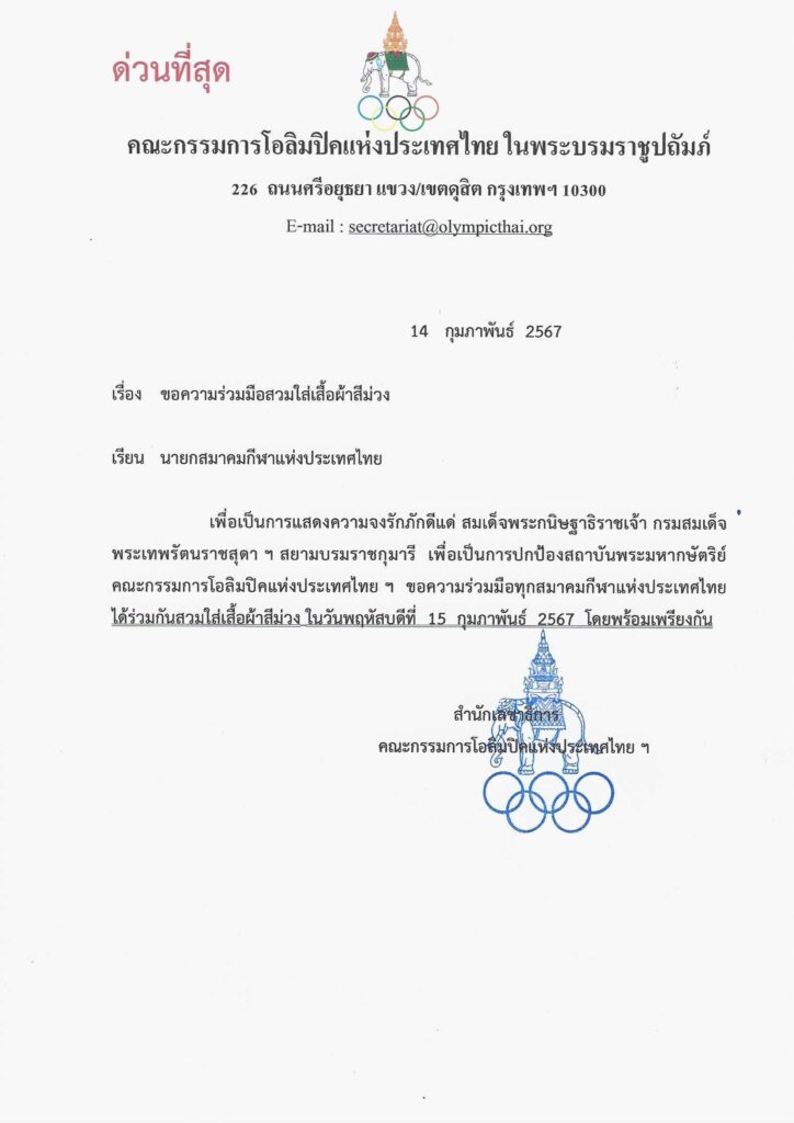 ล่าสุดเมื่อวันที่ 14 กุมภาพันธ์ คณะกรรมการโอลิมปิคแห่งประเทศไทย ในพระบรมราชูปถัมภ์ โดยสำนักเลขาธิการ ส่งหนังสือเรียนถึงนายกสมาคมกีฬาแห่งประเทศไทย เรื่องขอความร่วมมือสวมเสื้อผ้าสีม่วง เพื่อเป็นการแสดงความจงรักภักดีแด่ สมเด็จพระกนิษฐาธิราชเจ้า กรมสมเด็จพระเทพรัตนราชสุดาฯ เพื่อเป็นการปกป้องสถาบันพระมหากษัตริย์