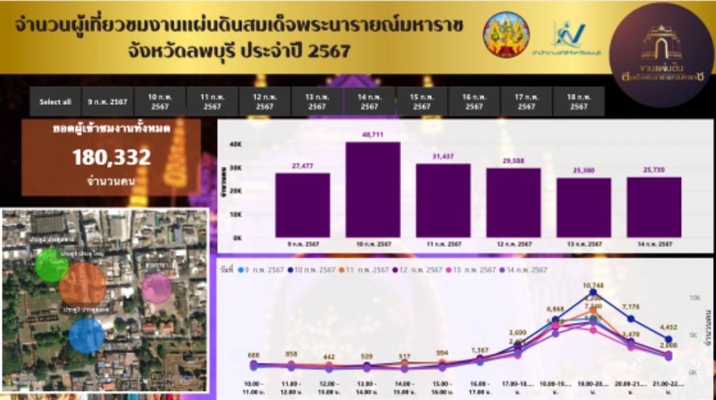 ทั้งนี้ จากข้อมูลที่รวบรวมโดยสำนักงานสถิติจังหวัดลพบุรี จำนวนนักท่องเที่ยวที่หลั่งไหลเข้ามาเที่ยวชมงานแผ่นดินสมเด็จพระนารายณ์มหาราช 2567 ครั้งที่ 36 ประจำปี 2567 ตั้งแต่วันที่ 9-14 กุมภาพันธ์ 2567 (วันที่ 6) มีนักท่องเที่ยวชมงาน ทั้งสิ้นจำนวน 180,332 คน โดยมีนักท่องเที่ยวชมงานมากสุดในวันที่ 10 กุมภาพันธ์ จำนวน 40,711 คน และช่วงเวลา นักท่องเที่ยวหนาแน่นที่สุดคือช่วง 19:00 น. ถึง 20:00 น.
