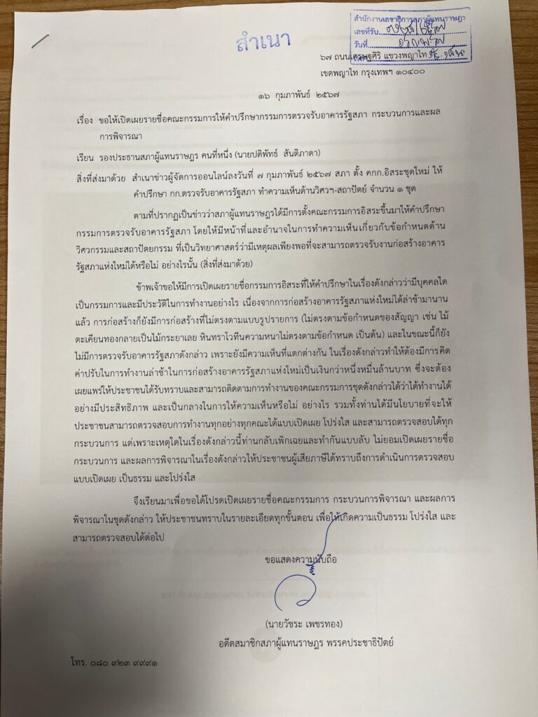 จึงเรียนมาเพื่อขอได้โปรดเปิดเผยรายชื่อคณะกรรมการ กระบวนการพิจารณา และผลการพิจารณาในชุดดังกล่าว ให้ประชาชนทราบในรายละเอียดทุกขั้นตอน เพื่อให้เกิดความเป็นธรรม โปร่งใส และสามารถตรวจสอบได้ต่อไป”