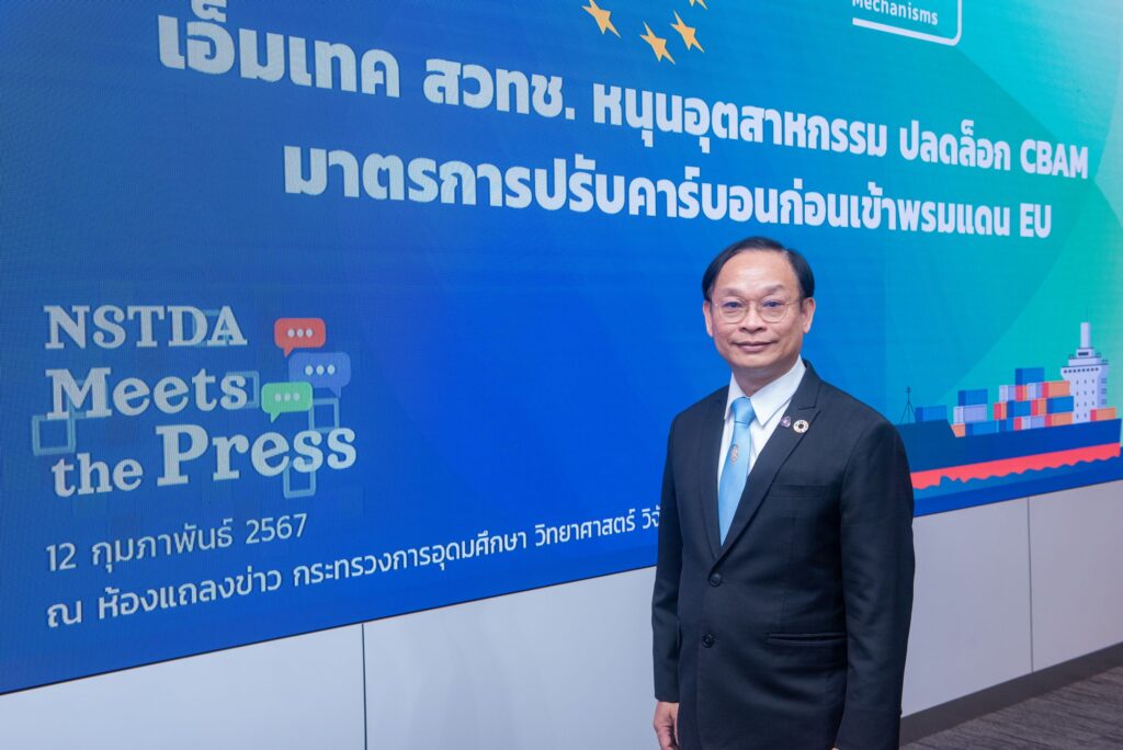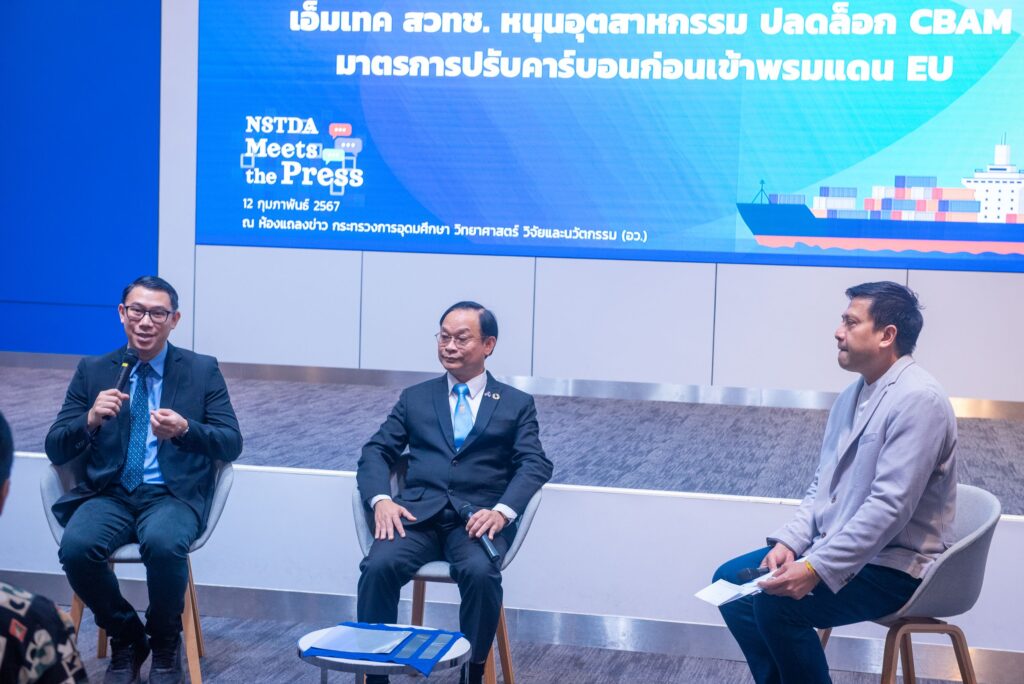 เมื่อวันที่ 12 กุมภาพันธ์ 2567 ณ ห้องแถลงข่าวกระทรวง อว.ชั้น 1 ถนนพระรามที่ 6 : สำนักงานพัฒนาวิทยาศาสตร์และเทคโนโลยีแห่งชาติ (สวทช.) กระทรวงการอุดมศึกษา วิทยาศาสตร์ วิจัยและนวัตกรรม (อว.) นำโดย ดร.จิตติ มังคละศิริ หัวหน้าทีมวิจัยพัฒนาฐานข้อมูลตลอดวัฏจักรชีวิตและการประยุกต์เพื่อการพัฒนาที่ยั่งยืนและการค้า สถาบันเทคโนโลยีและสารสนเทศเพื่อการพัฒนาที่ยั่งยืน ศูนย์เทคโนโลยีโลหะและวัสดุแห่งชาติ (เอ็มเทค) สำนักงานพัฒนาวิทยาศาสตร์และเทคโนโลยีแห่งชาติ (สวทช.) พร้อมด้วย นายธีรพันธุ์ พิมพ์ทอง ประธานกิตติมศักดิ์กลุ่มอุตสาหกรรมอะลูมิเนียม สภาอุตสาหกรรมแห่งประเทศไทย (ส.อ.ท.) ให้สัมภาษณ์พิเศษสื่อมวลชน ในกิจกรรม NSTDA Meets the Press เรื่อง: มาตรการ CBAM ใครพร้อม ได้ไปต่อ ชวนปลดล็อก การปรับคาร์บอนก่อนเข้าพรมแดนสหภาพยุโรป หรือ EU