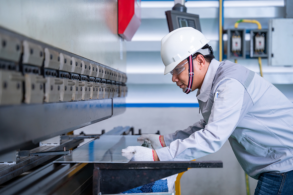 Asian technician worker wearing a safety suit and sheet Metal Bending in industrial factory, Safety first concept.