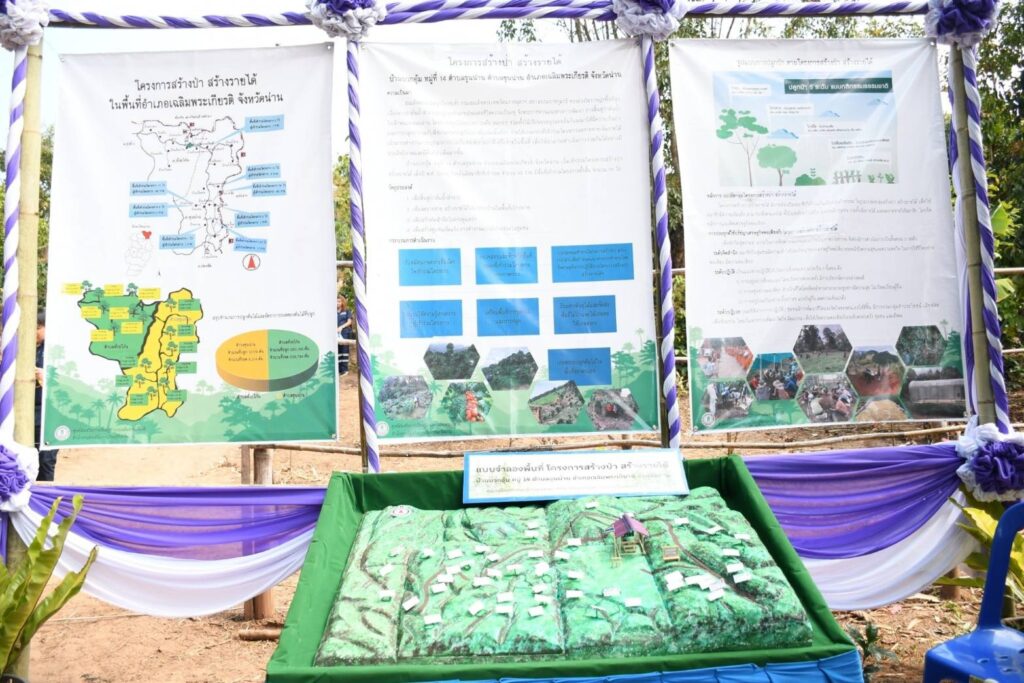 สำหรับโครงการสร้างป่า สร้างรายได้ ตามพระราชดำริฯ นั้น กรมส่งเสริมการเรียนรู้ (สกร.) หรือสำนักงาน (กศน.) เดิม ได้ดำเนินการขับเคลื่อนโครงการมาอย่างต่อเนื่องตั้งแต่ปี 2558 จนถึงปัจจุบัน โดยมีวัตถุประสงค์เพื่อฟื้นฟูป่าต้นน้ำลำธาร ลดรายจ่าย สร้างรายได้ สร้างจิตสำนึกในการดูแลป่า และสร้างชุมชนเข้มแข็งโดยการทำงานแบบมีส่วนร่วม และจากการติดตามงานโครงการสร้างป่า สร้างรายได้ ตามพระราชดำริฯ ณ แปลงเกษตรกรตัวอย่าง บ้านบวกอุ้มในครั้งนี้ พบว่าการดำเนินตามโครงการมีการขยายผล ต่อยอดความสำเร็จเห็นเชิงประจักษ์เป็นอย่างมาก โดยปัจจุบันกลุ่มสร้างป่า สร้างรายได้บ้านบวกอุ้ม มีจำนวนสมาชิก 49 คน พืชที่ปลูกและสร้างรายได้มากที่สุด ได้แก่ กาแฟพันธุ์อาราบิก้า และต้นก๋ง ที่เป็นวัตถุดิบในการทำไม้กวาด โดยในปีนี้กาแฟสามารถขายได้ในราคากิโลกรัมละ 170 -200 บาท หากเป็นพันธุ์ต้นกล้ากาแฟ จะเพาะขายในราคาต้นละ 15-20 บาท ส่วนดอกหญ้าก๋งราคากิโลกรัมละประมาณ 80 บาท ซึ่งผลผลิตทั้ง 3 ประเภทนี้ ตลาดยังมีความต้องการเป็นจำนวนมาก ทำให้กลุ่มสมาชิกผลิตไม่เพียงพอต่อความต้องการของตลาด