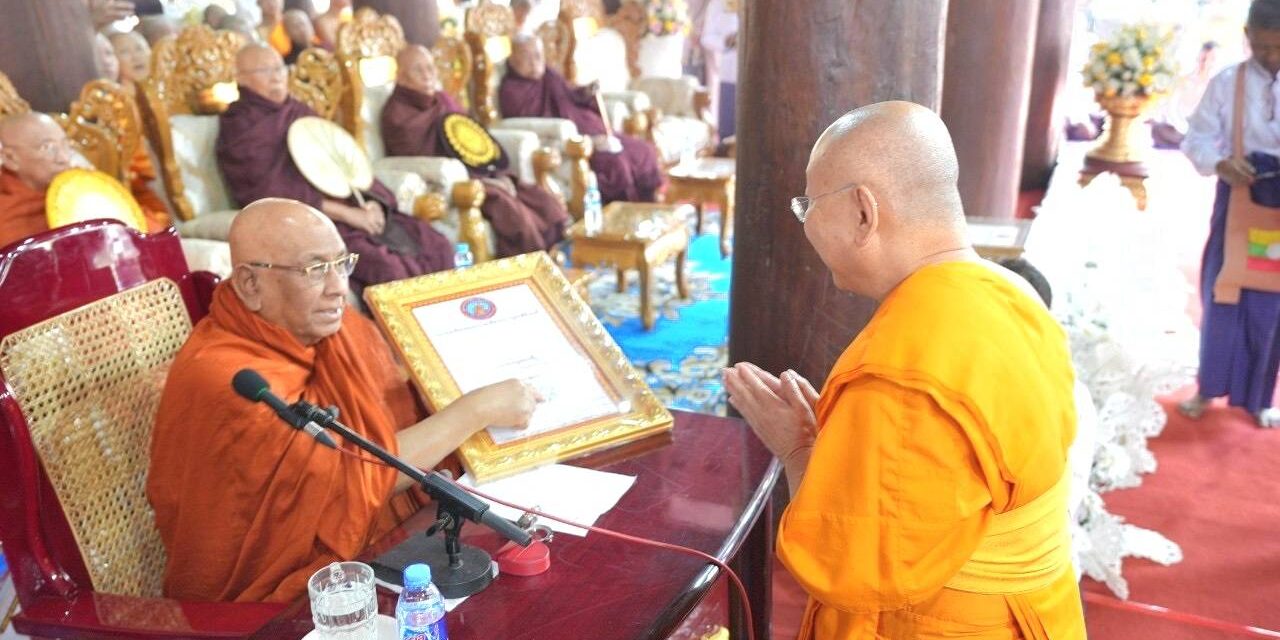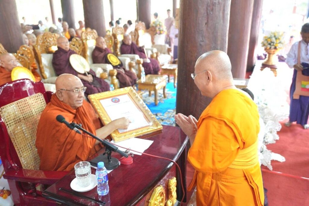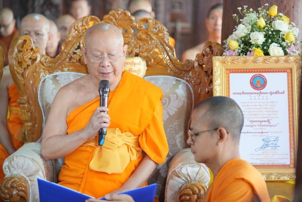พระมหานพพร กล่าวเพิ่มว่า เมื่อวันอาทิตย์ที่ 18 ก.พ. สิตากู สยาดอร์ ดร.ภัททันตะ ญานิสสระ อภิธชมหารัฐคุรุ สมเด็จพระสังฆนายกแห่งนิกายชเวจิน นายกสภาสถาบันพระพุทธศาสนานานาชาติสิตากู เป็นประธานในพิธีเจริญพระพุทธมนต์และถวายมหาสังฆทานในโอกาสสมโภชพระอุโบสถไม้สัก ในการนี้พระเดชพระคุณพระภาวนาธรรมวิเทศ ผู้ช่วยเจ้าอาวาสวัดพระธรรมกาย ในนามคณะสงฆ์ประเทศไทย เข้ารับประกาศเกียรติคุณยกย่องหลวงพ่อธัมมชโย วัดพระธรรมกาย ในฐานะผู้บำเพ็ญคุณประโยชน์เผยแผ่พระพุทธศาสนาไปทั่วโลก พร้อมทั้งกล่าวปสาทนียกถา จากนั้นคณะศิษยานุศิษย์ได้น้อมถวายมหาสังฆทานแด่คณะสงฆ์ 200 รูป